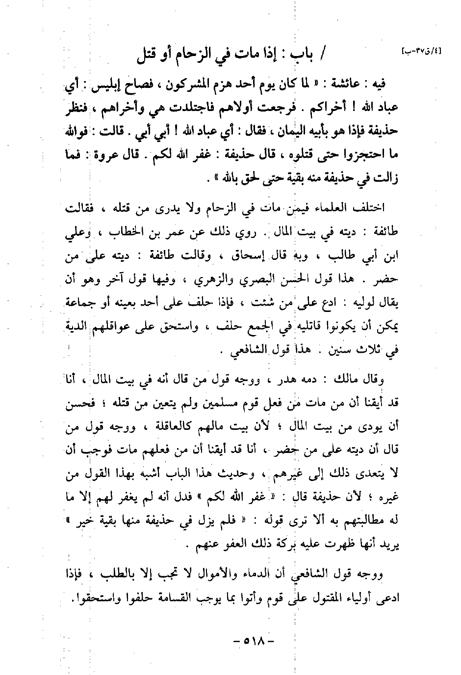 / 24 - فيه: عَائِشَةَ: لَمَّا كَانَ يَوْمُ أُحُدٍ هُزِمَ الْمُشْرِكُونَ، فَصَاحَ إِبْلِيسُ: أَىْ عِبَادَ اللَّهِ، أُخْرَاكُمْ، فَرَجَعَتْ أُولاهُمْ، فَاجْتَلَدَتْ هِىَ وَأُخْرَاهُمْ، فَنَظَرَ حُذَيْفَةُ، فَإِذَا هُوَ بِأَبِيهِ الْيَمَانِ، فَقَالَ: أَىْ عِبَادَ اللَّهِ، أَبِى، أَبِى، قَالَتْ: فَوَاللَّهِ مَا احْتَجَزُوا حَتَّى قَتَلُوهُ، قَالَ حُذَيْفَةُ: غَفَرَ اللَّهُ لَكُمْ. قَالَ عُرْوَةُ: فَمَا زَالَتْ فِى حُذَيْفَةَ مِنْهُ بَقِيَّةُ خَيْرٍ حَتَّى لَحِقَ بِاللَّهِ. اختلف العلماء فيمن مات فى الزحام ولا يدرى من قتله، فقالت طائفة: ديته فى بيت المال. روى ذلك عن عمر بن الخطاب، وعلى بن أبى طالب، وبه قال إسحاق، وقالت طائفة: دينه على من حضر. هذا قول الحسن البصرى والزهرى، وفيها قول آخر وهو أن يقال لوليه: ادع على من شئت، فإذا حلف على أحد بعينه أو جماعة يمكن أن يكونوا قاتليه فى الجمع حلف، واستحق على عواقلهم الدية فى ثلاث سنين. هذا قول الشافعى. وقال مالك: دمه هدر، ووجه قول من قال أنه فى بيت المال، أنا قد أيقنا أن من مات من فعل قوم مسلمين ولم يتعين من قتله؛ فحسن أن يودى من بيت المال؛ لأن بيت مالهم كالعاقلة، ووجه قول من قال: إن ديته على من حضر، أنا قد أيقنا أن من فعلهم مات فوجب أن لا يتعدى ذلك إلى غيرهم، وحديث هذا الباب أشبه بهذا القول من غيره؛ لأن حذيفة قال: (غفر الله لكم) فدل أنه لم يغفر لهم إلا ما له مطالبتهم به ألا ترى قوله: (فلم يزل فى حذيفة منها بقية خير) يريد أنها ظهرت عليه بركة ذلك العفو عنهم. ووجه قول الشافعى أن الدماء والأموال لا تجب إلا بالطلب، فإذا ادعى أولياء المقتول على قوم وأتوا بما يوجب القسامة حلفوا واستحقوا.