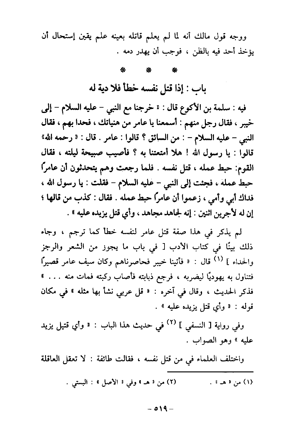 / 25 - فيه: سَلَمَةَ بن الأكواع، قَالَ: (خَرَجْنَا مَعَ النَّبِىِّ (صلى الله عليه وسلم) إِلَى خَيْبَرَ، فَقَالَ رَجُلٌ مِنْهُمْ: أَسْمِعْنَا يَا عَامِرُ مِنْ هُنَيْهَاتِكَ، فَحَدَا بِهِمْ، فَقَالَ النَّبِىُّ (صلى الله عليه وسلم) : مَنِ السَّائِقُ؟ قَالُوا: عَامِرٌ، فَقَالَ: رَحِمَهُ اللَّهُ، فَقَالُوا: يَا رَسُولَ اللَّهِ، هَلا أَمْتَعْتَنَا بِهِ، فَأُصِيبَ صَبِيحَةَ لَيْلَتِهِ، فَقَالَ الْقَوْمُ: حَبِطَ عَمَلُهُ قَتَلَ نَفْسَهُ، فَلَمَّا رَجَعْتُ، وَهُمْ يَتَحَدَّثُونَ أَنَّ عَامِرًا حَبِطَ عَمَلُهُ، فَجِئْتُ إِلَى النَّبِىِّ (صلى الله عليه وسلم) ، فَقُلْتُ: يَا نَبِىَّ اللَّهِ، فَدَاكَ أَبِى وَأُمِّى، زَعَمُوا أَنَّ عَامِرًا حَبِطَ عَمَلُهُ، فَقَالَ: كَذَبَ مَنْ قَالَهَا، إِنَّ لَهُ لأجْرَيْنِ اثْنَيْن، إِنَّهُ لَجَاهِدٌ مُجَاهِدٌ، وَأَىُّ قَتْلٍ يَزِيدُهُ عَلَيْهِ) . لم يذكر فى هذا صفة قتل عامر لنفسه خطأ كما ترجم، وجاء ذلك بينًا فى كتاب الأدب فى باب ما يجوز من الشعر والرجز والحداء، قال: (فأتينا خيبر فحاصرناهم وكان سيف عامر قصيرًا فتناول به يهوديًا ليضربه، فرجع ذبابته فأصاب ركبته فمات منه. .) فذكر الحديث، وقال فى آخره: (قل عربى نشأ بها مثله) فى مكان قوله: (وأى قتل يزيده عليه) . وفى رواية النسفى فى حديث هذا الباب: (وأى قتيل يزيد عليه) وهو الصواب. واختلف العلماء فى من قتل نفسه، فقالت طائفة: لا تعقل العاقلة