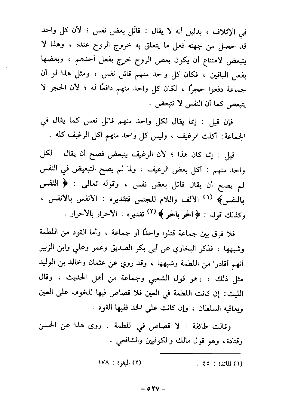 فى الإتلاف، بدليل أنه لا يقال: قاتل بعض نفس؛ لأن كل واحد قد حصل من جهته فعل ما يتعلق به خروج الروح عنده، وهذا لا يتبعض لامتناع أن يكون بعض الروح خرج بفعل أحدهم، وبعضها بفعل الباقين، فكان كل واحد منهم قاتل نفس، ومثل هذا لو أن جماعة دفعوا حجرًا، لكان كل واحد منهم دافعًا له؛ لأن الحجر لا يتبعض كما أن النفس لا تتبعض. فإن قيل: إنما قال لكل واحد منهم قاتل نفس كما يقال فى الجماعة: أكلت الرغيف، وليس كل واحد منهم أكل الرغيف كله. قيل: إنما كان هذا؛ لأن الرغيف يتبعض، فصح أن يقال لكل واحد منهم: أكل بعض الرغيف، ولما لم يصح التبعيض فى النفس لم يصح أن يقال قاتل بعض نفس، وقوله تعالى: (النفس بالنفس) [المائدة: 45] الألف واللام للجنس فتقديره: الأنفس بالأنفس، وكذلك قوله: (الحر بالحر) [البقرة: 178] تقديره: الأحرار بالأحرار. فلا فرق بين جماعة قتلوا واحدًا أو جماعة، وأما القود من اللطمة وشبهها، فذكر البخارى عن أبى بكر الصديق وعمر وعلى وابن الزبير أنهم أقادوا من اللطمة وشبهها، وقد روى عن عثمان وخالد بن الوليد مثل ذلك، وهو قول الشعبى وجماعة من أهل الحديث، وقال الليث: إن كانت اللطمة فى العين فلا قصاص فيها للخوف على العين ويعاقبه السلطان، وإن كانت على الخد ففيها القود. وقالت طائفة: لا قصاص فى اللطمة. فروى هذا عن الحسن وقتادة، وهو قول مالك والكوفيين والشافعى.