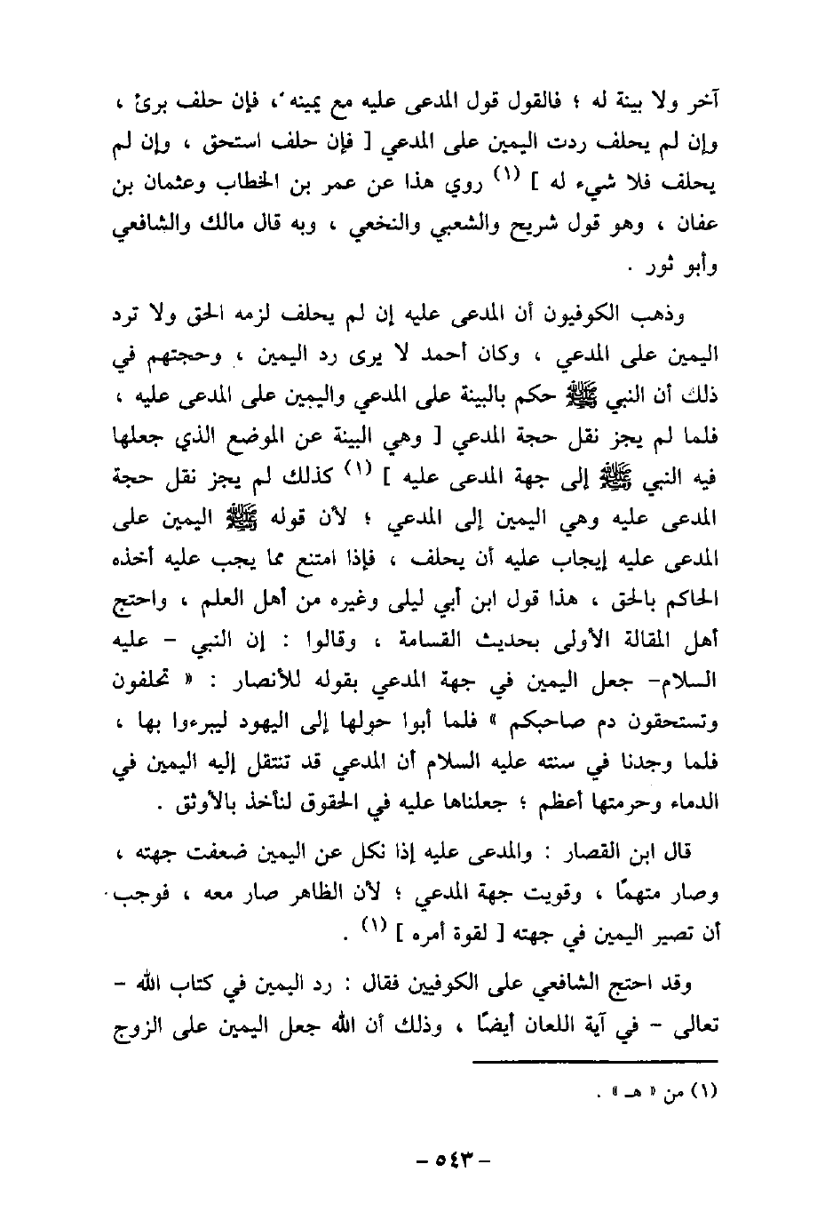 آخر ولا بينة له؛ فالقول قول المدعى عليه مع يمينه، فإن حلف برئ، وإن لم يحلف ردت اليمين على المدعى فإن حلف استحق، وإن لم يحلف فلا شىء له، روى هذا عن عمر بن الخطاب وعثمان بن عفان، وهو قول شريح والشعبى والنخعى، وبه قال مالك والشافعى وأبو ثور. وذهب الكوفيون أن المدعى عليه إن لم يحلف لزمه الحق ولا ترد اليمين على المدعى، وكان أحمد لا يرى رد اليمين، وحجتهم فى ذلك أن النبى (صلى الله عليه وسلم) حكم بالبينة على المدعى واليمين على المدعى عليه، فلما لم يجز نقل حجة المدعى وهى البينة عن الموضع الذى جعلها فيه النبى (صلى الله عليه وسلم) إلى جهة المدعى عليه كذلك لم يجز نقل حجة المدعى عليه وهى اليمين إلى المدعى؛ لأن قوله اليمين على المدعى عليه إيجاب عليه أن يحلف، فإذا امتنع مما يجب عليه أخذه الحاكم بالحق، هذا قول ابن أبى ليلى وغيره من أهل العلم، واحتج أهل المقالة الأولى بحديث القسامة، وقالوا: إن النبى (صلى الله عليه وسلم) جعل اليمين فى جهة المدعى بقوله للأنصار: (تحلفون وتستحقون دم صاحبكم) فلما أبوا حولها إلى اليهود ليبرءوا بها، فلما وجدنا فى سنته (صلى الله عليه وسلم) أن المدعى قد تنقل إليه اليمين فى الدماء وحرمتها أعظم؛ جعلناها عليه فى الحقوق لنأخذ بالأوثق. قال ابن القصار: والمدعى عليه إذا نكل عن اليمين ضعفت جهته، وصار متهمًا، وقويت جهة المدعى؛ لأن الظاهر صار معه، فوجب أن تصير اليمين فى جهته لقوة أمره. وقد احتج الشافعى على الكوفيين فقال: رد اليمين فى كتاب الله تعالى فى آية اللعان أيضًا، وذلك أن الله جعل اليمين على الزوج