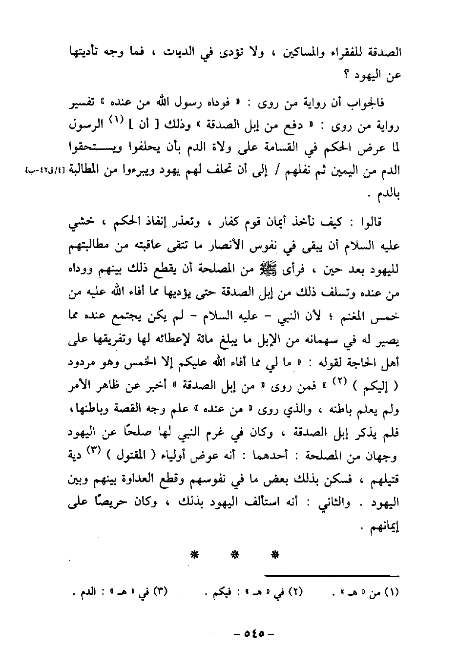 الصدقة للفقراء والمساكين، ولا تؤدى فى الديات، فما وجه تأديتها عن اليهود؟ فالجواب: أن رواية من روى: (فوداه رسول الله (صلى الله عليه وسلم) من عنده) تفسير رواية من روى: (دفع من إبل الصدقة) وذلك أن الرسول لما عرض الحكم فى القسامة على ولاة الدم بأن يحلفوا ويستحقوا الدم من اليمين ثم نفلهم إلى أن تحلف لهم يهود ويبرءوا من المطالبة بالدم. قالوا: كيف نأخذ أيمان قوم كفار، وتعذر إنفاذ الحكم، خشى (صلى الله عليه وسلم) أن يبقى فى نفوس الأنصار ما تتقى عاقبته من مطالبتهم لليهود بعد حين، فرأى (صلى الله عليه وسلم) من المصلحة أن يقطع ذلك بينهم ووداه من عنده وتسلف ذلك من إبل الصدقة حتى يؤديها مما أفاء الله عليه من خمس المغنم؛ لأن النبى (صلى الله عليه وسلم) لم يكن يجتمع عنده مما يصير له فى سهمانه من الإبل ما يبلغ مائة لإعطائه لها وتفريقها على أهل الحاجة لقوله: (ما لى مما أفاء الله عليكم إلا الخمس وهو مردود إليكم) فمن روى (من إبل الصدقة) أخبر عن ظاهر الأمر ولم يعلم باطنه، والذى روى (من عنده) علم وجه القصة وباطنها، فلم يذكر إبل الصدقة، وكان فى غرم النبى لها صلحًا عن اليهود وجهان من المصلحة: أحدهما: أنه عوض أولياء المقتول دية قتيلهم، فسكن بذلك بعض ما فى نفوسهم وقطع العداوة بينهم وبين اليهود. والثانى: أنه استألف اليهود بذلك، وكان حريصًا على إيمانهم.