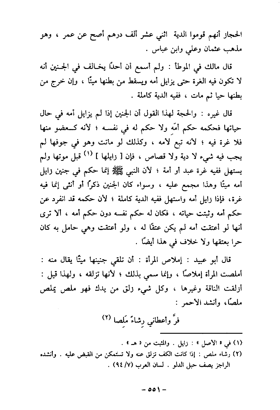 الحجاز أنهم قوموا الدية اثنى عشر ألف درهم أصح عن عمر، وهو مذهب عثمان وعلى وابن عباس. قال مالك فى الموطأ: ولم أسمع أن أحدًا يخالف فى الجنين أنه لا تكون فيه الغرة حتى يزايل أمه ويسقط من بطنها ميتًا، وإن خرج من بطنها حيا ثم مات، ففيه الدية كاملة. قال غيره: والحجة لهذا القول أن الجنين إذا لم يزايل أمه فى حال حياتها فحكمه حكم أمّهِ ولا حكم له فى نفسه؛ لأنه كعضو منها فلا غرة فيه؛ لأنه تبع لأمه، وكذلك لو ماتت وهو فى جوفها لم يجب فيه شىء لا دية ولا قصاص، فإن زايلها قبل موتها ولم يستهل ففيه غرة عبد أو أمة؛ لأن النبى (صلى الله عليه وسلم) إنما حكم فى جنين زايل أمه ميتًا وهذا مجمع عليه، وسواء كان الجنين ذكرًا أو أنثى إنما فيه غرة، فإذا زايل أمه واستهل ففيه الدية كاملة؛ لأن حكمه قد انفرد عن حكم أمه وثبتت حياته، فكان له حكم نفسه دون حكم أمه، ألا ترى أنها لو أعتقت أمه لم يكن عتقًا له، ولو أعتقت وهى حامل به كان حرا بعتقها ولا خلاف فى هذا أيضًا. قال أبو عبيد: إملاص المرأة: أن تلقى جنينها ميتًا يقال منه: أملصت المرأة إملاصًا، وإنما سمى بذلك؛ لأنها تزلقه، ولهذا قيل: أزلقت الناقة وغيرها، وكل شىء زلق من يدك فهو ملص يملص ملصًا، وأنشد الأحمر: فرَّ وأعطانى رِشاءً مَلِصا