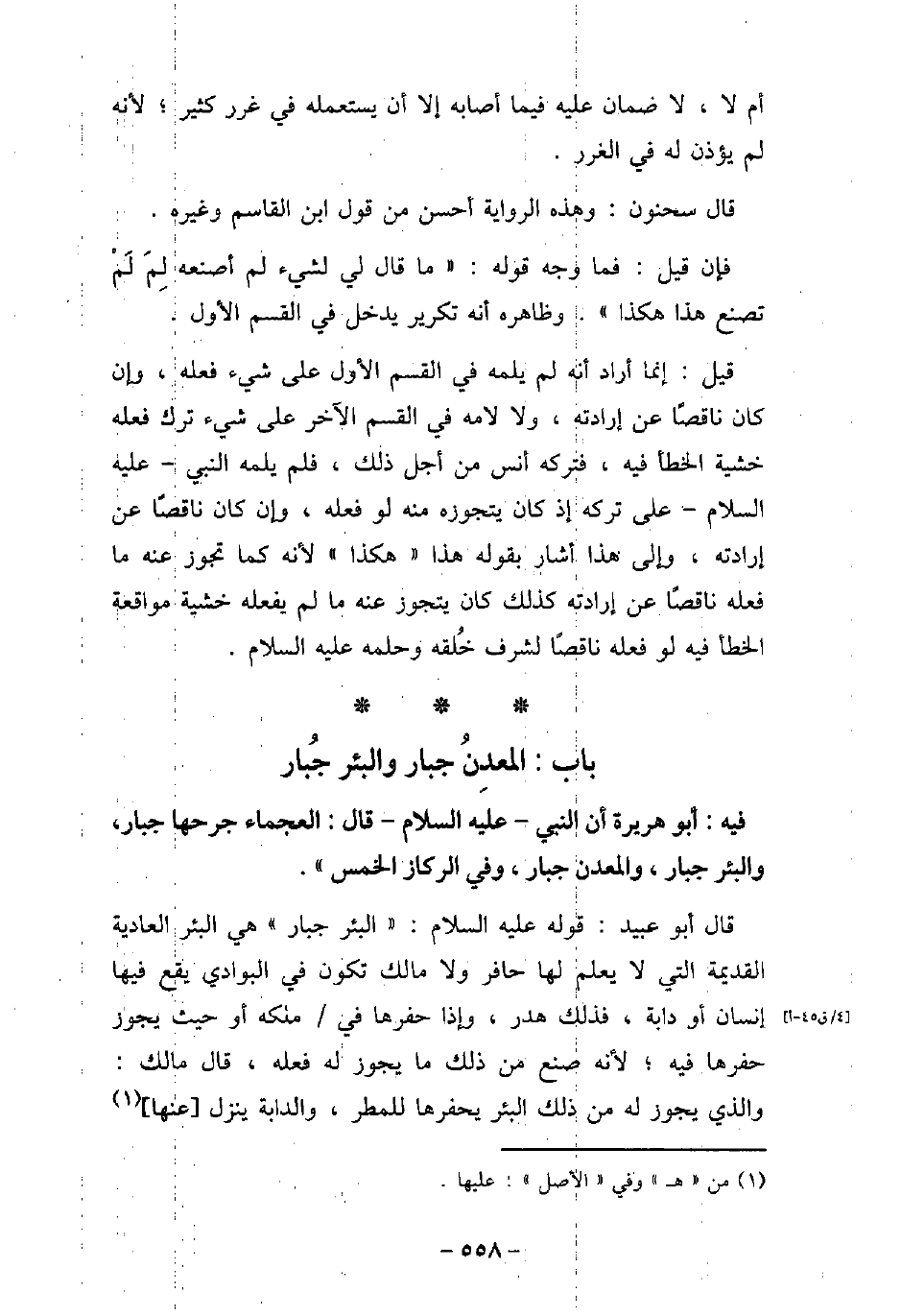 / 44 - فيه: أَبُو هُرَيْرَةَ أَنَّ النبى (صلى الله عليه وسلم) قَالَ: (الْعَجْمَاءُ جَرْحُهَا جُبَارٌ، وَالْبِئْرُ جُبَارٌ، وَالْمَعْدِنُ جُبَارٌ، وَفِى الرِّكَازِ الْخُمُسُ) . قال أبو عبيد: قوله (صلى الله عليه وسلم) : (البئر جبار) هى البئر العادية القديمة التى لا يعلم لها حافر ولا مالك تكون فى البوادى يقع فيها إنسان أو دابة، فلذلك هدر، وإذا حفرها فى ملكه أو حيث يجوز حفرها فيه؛ لأنه صنع من ذلك ما يجوز له فعله، قال مالك: والذى يجوز له من ذلك البئر يحفرها للمطر، والدابة ينزل عنها