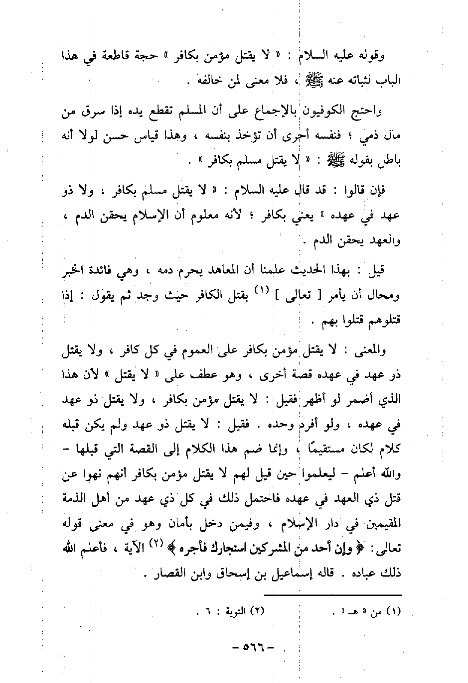 وقوله (صلى الله عليه وسلم) : (لا يقتل المؤمن بكافر) حجة قاطعة فى هذا الباب لثباته عنه (صلى الله عليه وسلم) ، فلا معنى لمن خالفه. واحتج الكوفيون بالإجماع على أن المسلم تقطع يده إذا سرق من مال ذمى؛ فنفسه أحرى أن تؤخذ بنفسه، وهذا قياس حسن لولا أنه باطل بقوله (صلى الله عليه وسلم) : (لا يقتل مسلم بكافر) . فإن قالوا: قد قال (صلى الله عليه وسلم) : (لا يقتل مسلم بكافر، ولا ذو عهد فى عهده) يعنى بكافر؛ لأنه معلوم أن الإسلام يحقن الدم، والعهد يحقن الدم. قيل: بهذا الحديث علمنا أن المعاهد يحرم دمه، وهى فائدة الخبر ومحال أن يأمر تعالى بقتل الكافر حيث وجد ثم يقول: إذا قتلوهم قتلوا بهم. والمعنى: لا يقتل مؤمن بكافر على العموم فى كل كافر، ولا يقتل ذو عهد فى عهده قصة أخرى، وهو عطف على (لا يقتل) لأن هذا الذى أضمر لو أظهر فقيل: لا يقتل مؤمن بكافر، ولا يقتل ذو عهد فى عهده، ولو أفرد وحده. فقيل: لا يقتل ذو عهد ولم يكن قبله كلام لكان مستقيمًا، وإنما ضم هذا الكلام إلى القصة التى قبلها والله أعلم ليعلموا حين قيل لهم لا يقتل مؤمن بكافر أنهم نهوا عن قتل ذى العهد فى عهده فاحتمل ذلك فى كل ذى عهد من أهل الذمة المقيمين فى دار الإسلام، وفيمن دخل بأمان وهو فى معنى قوله تعالى: (وإن أحد من المشركين استجارك فأجره) [التوبة: 6] الآية، فأعلم الله ذلك عباده. قاله إسماعيل بن إسحاق وابن القصار.