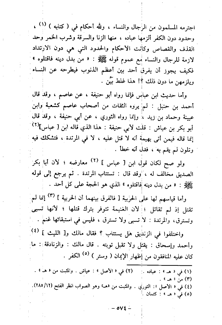 اجترمه المسلمون من الرجال والنساء، ولله أحكام فى كتابه، وحدود دون الكفر ألزمها عباده، منها الزنا والسرقة وشرب الخمر وحد القذف والقصاص وكانت الأحكام والحدود التى هى دون الارتداد لازمة للرجال والنساء مع عموم قوله (صلى الله عليه وسلم) : (من بدل دينه فاقتلوه) فكيف يجوز أن يفرق أحد بين أعظم الذنوب فيطرحه عن النساء ويلزمهن ما دون ذلك؟ هذا غلط بَيِّن. وأما حديث ابن عباس فإنما رواه أبو حنيفة، عن عاصم، وقد قال أحمد بن حنبل: لم يروه الثقات من أصحاب عاصم كشعبة وابن عيينة وحماد بن زيد، وإنما رواه الثورى، عن أبى حنيفة، وقد قال أبو بكر بن عياش: قلت لأبى حنيفة: هذا الذى قاله ابن عباس إنما قاله فيمن أتى بهيمة أنه لا قتل عليه، لا فى المرتدة، فتشكك فيه وتلون لم يقم به، فدل أنه خطأ. ولو صح لكان قول ابن عباس معارضه؛ لأن أبا بكر الصديق مخالف له، وقد قال: تستتاب المرتدة. ثم يرجع إلى قوله (صلى الله عليه وسلم) : (من بدل دينه فاقتلوه) الذى هو الحجة على كل أحد. وأما قياسهم لها على الحربية فالفرق بينهما أن الحربية إنما لم تقتل إذ لم تقاتل؛ لأن الغنيمة تتوفر بترك قتلها؛ لأنها تسبى وتسترق، والمرتدة: لا تسبى ولا تسترق، فليس فى استبقائها غنم. واختلفوا فى الزنديق هل يستتاب؟ فقال مالك والليث وأحمد وإسحاق: يقتل ولا تقبل توبته. قال مالك: والزنادقة: ما كان عليه المنافقون من إظهار الإيمان وستر الكفر.