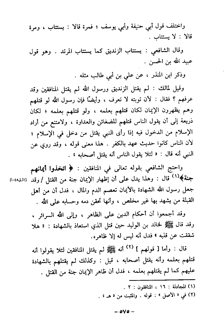 واختلف قول أبى حنيفة وأبى يوسف؛ فمرة قالا: يستتاب، ومرة قالا: لا يستتاب. وقال الشافعى: يستتاب الزنديق كما يستتاب المرتد. وهو قول عبيد الله بن الحسن. وذكر ابن المنذر، عن على بن أبى طالب مثله. وقيل لمالك: لم يقتل الزنديق ورسول الله (صلى الله عليه وسلم) لم يقتل المنافقين وقد عرفهم؟ فقال: لأن توبته لا تعرف، وأيضًا فإن رسول الله (صلى الله عليه وسلم) لو قتلهم وهم يظهرون الإيمان لكان قتلهم بعلمه، ولو قتلهم بعلمه؛ لكان ذريعة إلى أن يقول الناس قتلهم للضغائن والعداوة، ولامتنع من أراد الإسلام من الدخول فيه إذا رأى النبى (صلى الله عليه وسلم) يقتل من دخل فى الإسلام؛ لأن الناس كانوا حديث عهد بالكفر. هذا معنى قوله، وقد روى عن النبى (صلى الله عليه وسلم) أنه قال: (لئلا يقول الناس أنه يقتل أصحابه) . واحتج الشافعى بقوله تعالى فى المنافقين: (واتخذوا أيمانهم جنة) [المجادلة: 16، المنافقون: 2] قال: وهذا يدل على أن إظهار الإيمان جنة من القتل وقد جعل رسول الله (صلى الله عليه وسلم) الشهادة بالأيمان تعصم الدم والمال، فدل أن من أهل القبلة من يشهد بها غير مخلص، وأنها تحقن دمه وحسابه على الله. وقد أجمعوا أن أحكام الدين على الظاهر، وإلى الله السرائر، وقد قال (صلى الله عليه وسلم) لخالد بن الوليد حين قتل الذى استعاذ بالشهادة: (هلا شققت عن قلبه) فدل أنه ليس له إلا ظاهره. قال: وأما قولهم أنه (صلى الله عليه وسلم) لم يقتل المنافقين لئلا يقولوا أنه قتلهم بعلمه وأنه يقتل أصحابه، قيل: وكذلك لم يقتلهم بالشهادة عليهم كما لم يقتلهم بعلمه، فدل أن ظاهر الإيمان جنة من القتل.