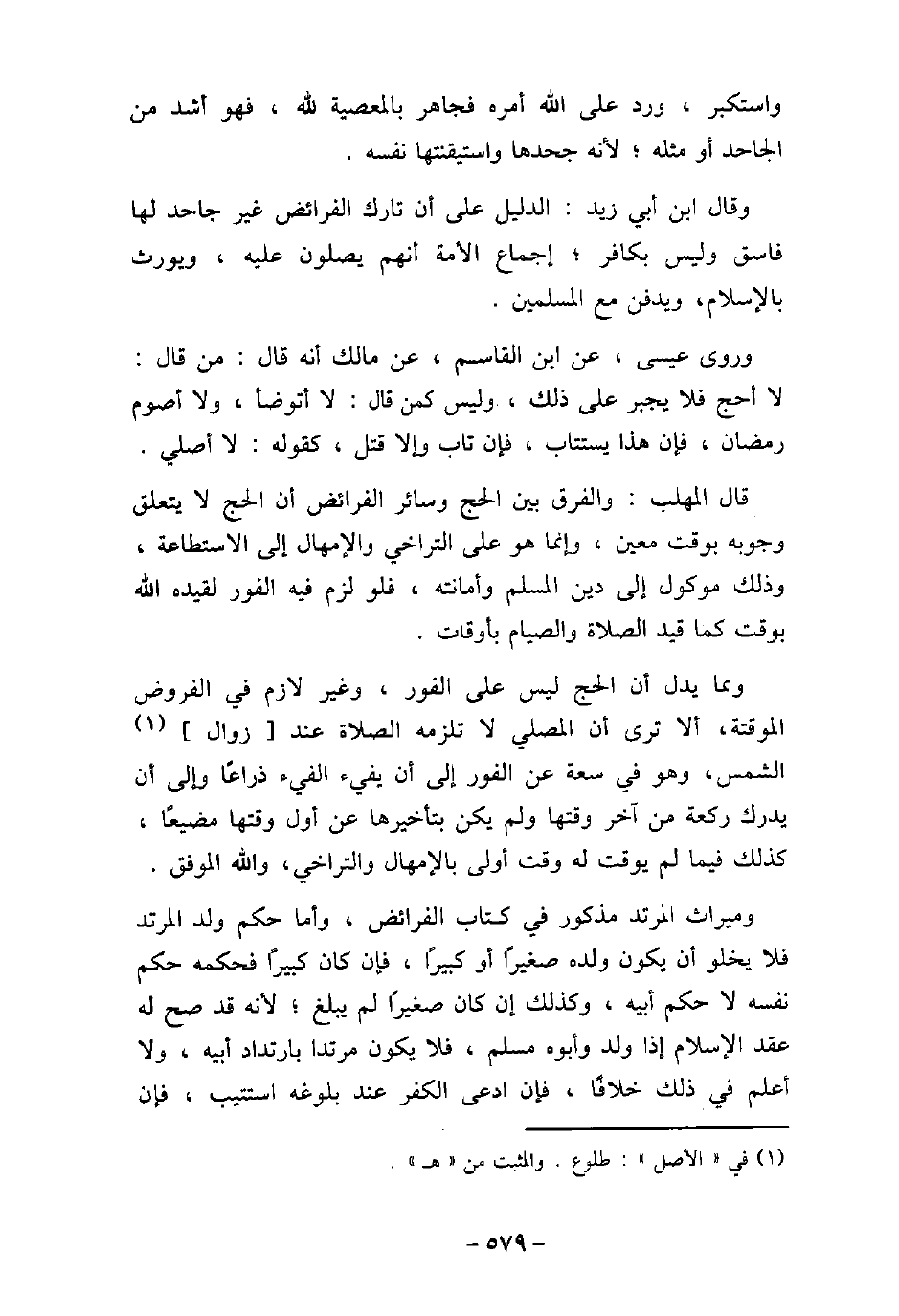 واستكبر، ورد على الله أمره فجاهر بالمعصية لله، فهو أشد من الجاحد أو مثله؛ لأنه جحدها واستيقنتها نفسه. وقال ابن أبى زيد: الدليل على أن تارك الفرائض غير جاحد لها فاسق وليس بكافر؛ إجماع الأمة أنهم يصلون عليه، ويورث بالإسلام، ويدفن مع المسلمين. وروى عيسى، عن ابن القاسم، عن مالك أنه قال: من قال: لا أحج فلا يجبر على ذلك، وليس كمن قال: لا أتوضأ، ولا أصوم رمضان، فإن هذا يستتاب، فإن تاب وإلا قتل، كقوله: لا أصلى. قال المهلب: والفرق بين الحج وسائر الفرائض أن الحج لا يتعلق وجوبه بوقت معين، وإنما هو على التراخى والإمهال إلى الاستطاعة، وذلك موكول إلى دين المسلم وأمانته، فلو لزم فيه الفور لقيده الله بوقت كما قيد الصلاة والصيام بأوقات. ومما يدل أن الحج ليس على الفور، وغير لازم فى الفروض الموقتة، ألا ترى أن المصلى لا تلزمه الصلاة عند زوال الشمس، وهو فى سعة عن الفور إلى أن يدرك ركعة من آخر وقتها ولم يكن بتأخيرها عن أول وقتها مضيعًا، كذلك فيما لم يوقت له وقت أولى بالإمهال والتراخى، والله الموفق. وميراث المرتد مذكور فى كتاب الفرائض، وأما حكم ولد المرتد فلا يخلو أن يكون ولده صغيرًا أو كبيرًا، فإن كان كبيرًا فحكمه حكم نفسه لا حكم أبيه، وكذلك إن كان صغيرًا لم يبلغ؛ لأنه قد صح له عقد الإسلام إذا ولد وأبوه مسلم، فلا يكون مرتدا بارتداد أبيه، ولا أعلم فى ذلك خلافًا، فإن ادعى الكفر عند بلوغه استتيب، فإن