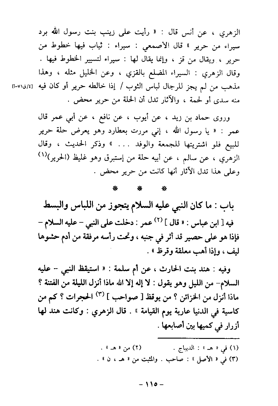 الزهري، عن أنس قال: (رأيت على زينب بنت رسول الله برد سيراء من حرير) قال الأصمعى: سيراء: ثياب فيها خطوط من حرير، ويقال من قز، وإنما يقال لها: سيراء لتسيير الخطوط فيها. وقال الزهرى: السيراء المضلع بالقزى، وعن الخليل مثله، وهذا مذهب من لم يجز للرجال لباس المصلع بالقزى، وعن الخليل مثله، وهذا مذهب من لم يجز للرجال لباس الثوب إذا خالطه حرير أو كان فيه منه سدى أو لحمة، والآثار تدل أن الحلة من حرير محض. روى حماد بن زيد، عن أيوب، عن نافع، عن أبى عمر قال عمر: (يا رسول الله، إنى مررت بعطارد وهو يعرض حلة حرير للبيع فلو اشتريتها للجمعة والوفد. . .) وذكر الحديث، وقال الزهرى، عن سالم، عن أبيه حلة من إستبرق وهو غليظ الحرير، وعلى هذا تدل الآثار أنها كانت من حرير محض.