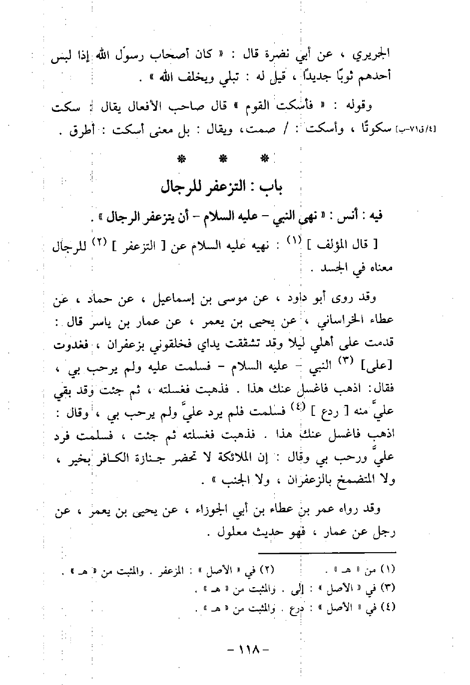 / 50 - فيه: أَنَس، قَالَ: نَهَى النَّبِىُّ، عليه السَّلام، أَنْ يَتَزَعْفَرَ الرَّجُلُ. قال المؤلف: نهيه عليه السلام عن التزعفر للرجال معناه فى الجسد. وقد روى أبو داود، عن موسى بن إسماعيل، عن حماد، عن عطاء الخراسانى، عن يحى بن يعمر، عن عمار بن ياسر قال: (قدمت على أهلى ليلاً وقد تشققت يداى فخلقونى بزعفران، فغدوت على النبى عليه السلام فسلمت عليه ولم يرحب بى، فقال: اذهب فاغسل عنك هذا. فذهب فغسلته، ثم جئت وقد بقى على منه ردع فسلمت فلم يرد على ولم يرحب بى وقال: اذهب فاغسل عنك هذا. فذهبت فغسلته ثم جئت، فسلمت فرد على ورحب بى وقال: إن الملائكة لا تحضر جنازة الكافر بخير، ولا المتضمخ بالزعفران، ولا الجنب) . وقد رواه بن عطاء بن أبى الجوزاء، عن يحى بن يعمر، عن رجل عن عمار، فهو حديث معلول.