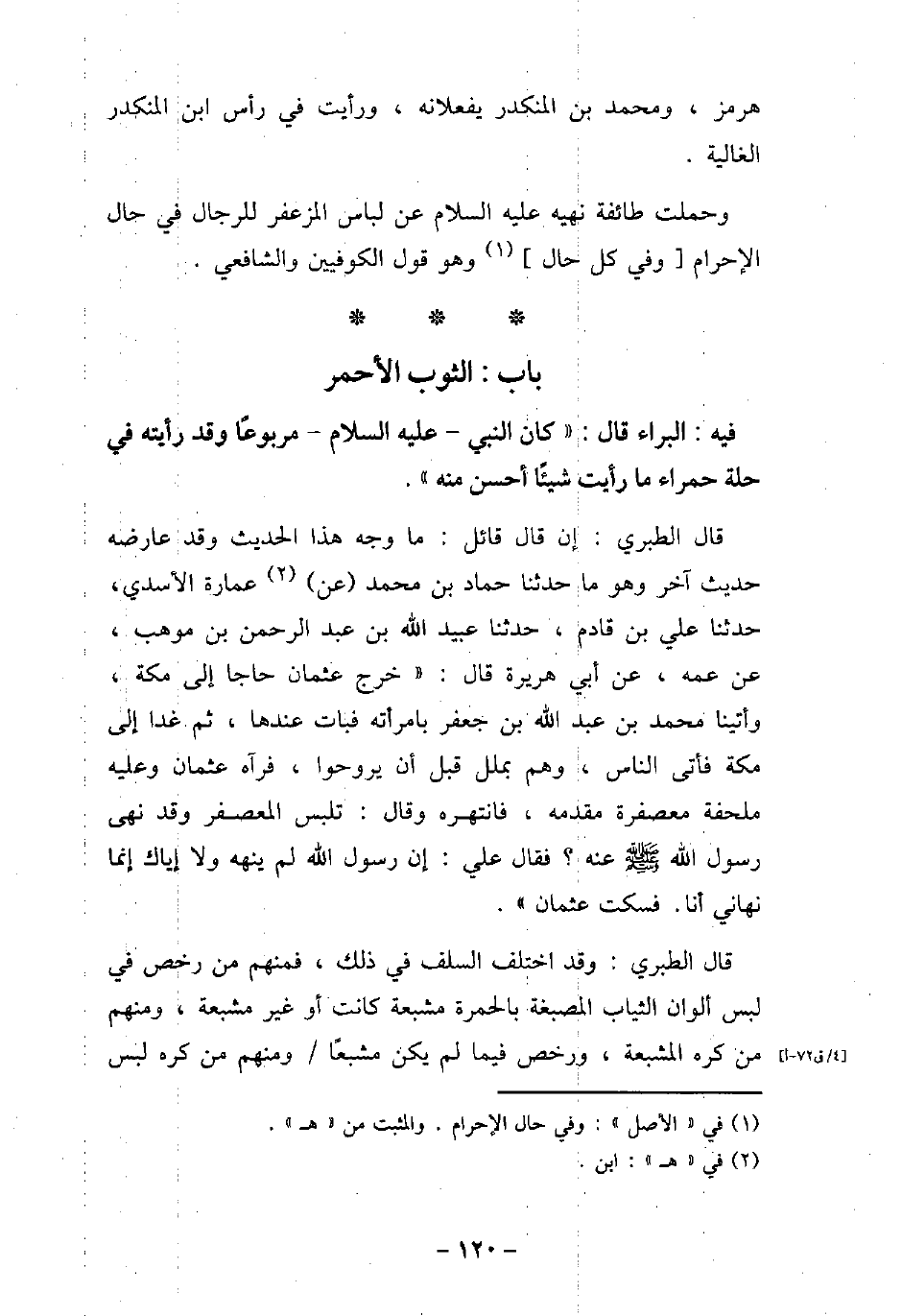 / 52 - فيه: الْبَرَاء، قَالَ: كَانَ النَّبِى عليه السَّلام، مَرْبُوعًا: وَقَدْ رَأَيْتُهُ فِى حُلَّةٍ حَمْرَاءَ مَا رَأَيْتُ شَيْئًا أَحْسَنَ مِنْهُ. قال الطبرى: إن قال قائل: ما وجه هذا الحديث وقد عارضه حديث آخر وهو ما حدثنا حماد بن محمد عن عمارة السدى، حدثنا على بن قادم، حدثنا عبيد الله بن عبد الرحمن بن موهب، عن عمه، عن أبى هريرة قال: (خرج عثمان حاجا إلى مكه، واتينا محمد بن عبد الله بن جعفر بامرأته فبات عندها، ثم غدا إلى مكة فأتى الناس، وهم بملل قبل أن يروحوا، فرآه عثمان وعليه ملحفة معصفرة مقدمة، فانتهز، وقال: تلبس المعصفر وقد نهى رسول الله عليه السلام عنه؟ فقال على: إن رسول الله لم ينهه ولا إياك إنما نهانى أنا. فسكت عثمان) . قال الطبرى: وقد اختلف السلف فى ذلك، فمنهم من رخص فى لبس ألوان الثياب المصبغه بالحمرة مشبعة كانت أو غير مشبعة، ومنهم من كره المشبعة، ورخص فيما لم يكن مشبعًا، ومنهم من كره لبس