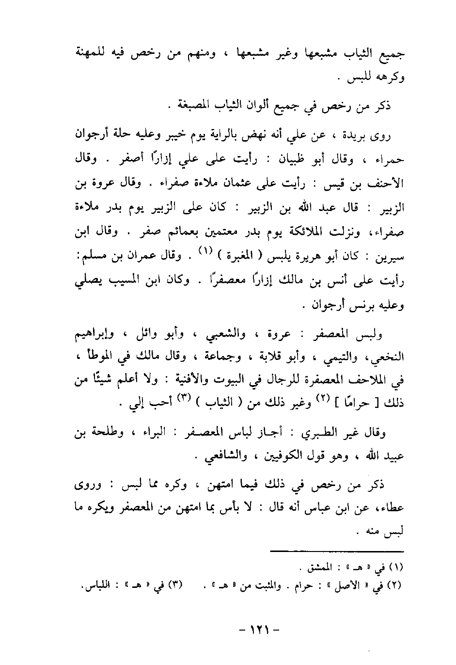 جميع الثياب مشبعها وغير مشبعها، ومنهم من رخص فيه للمهنة وكره للبس. ذكر من رخص فى جميع الوان الثياب الصبغة. روى بريدة، عن على أنه نهض بالراية يوم خبير وعليه حلة أرجوان حمراء، وقال أبو ظبيان: رايت على على إزارًا أصفر. وقال الأحنف بن قيس: رأيت على عثمان ملاءة صفراء. وقال عروة بن الزبير: قال عبد الله بن الزبير: كان على الزبير يوم بدر ملاءه صفراء، ونزلت الملائكة يوم بدر معتمين بعمائم صفر. وقال ابن سيرين: كان أبو هريرة يلبس المغيرة. وقال عمران بن مسلم: رأيت على أنس بن مالك إزار معصفرًا. وكان ابن المسيب يصلى وعليه برنس ارجوان. ولبس المعصفر: عروة، والشعبى، وابو وائل، وابراهيم النخعى، والتيمى، وابو قلابة، وجماعة، وقال مالك فى الموطأ، فى الملاحف المعصفرة للرجال فى البيوت والأفنية: ولا أعلم شيئًا من ذلك حرامًا وغير ذلك من الثياب أحب إلى. وقال غير الطبرى: أجاز لباس المعصفر: البراء، وطلحة بن عبيد الله، وهو قول الكوفيين، والشافعى. ذكر من رخص فى ذلك فيما امتهن، وكره مما لبس: وروى عطاء، عن ابن عباس أنه قال: لا بأس بما امتهن من المعصفر ويكره ما لبس منه.