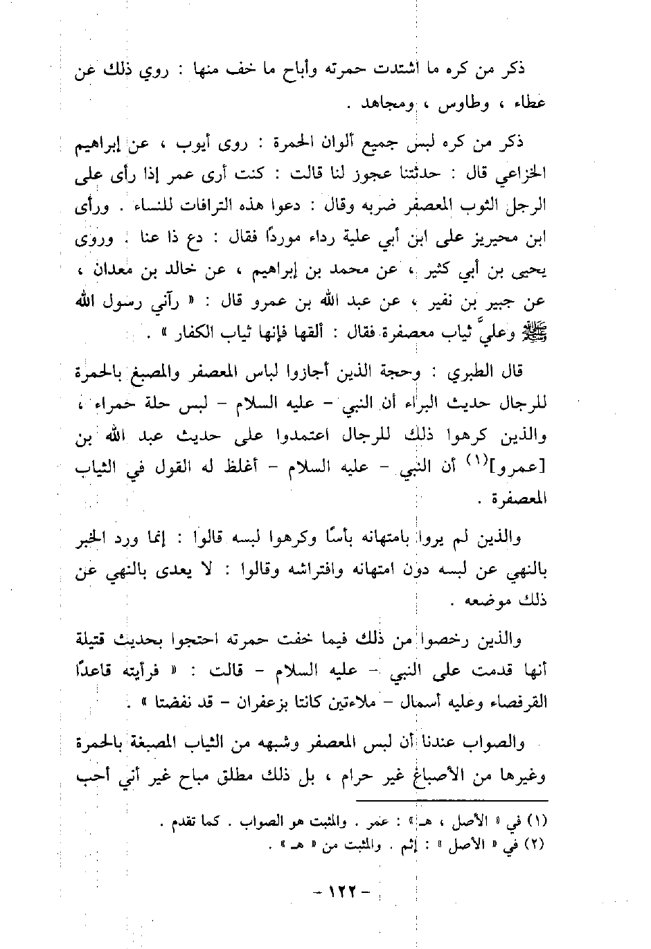 ذكر من كره مااشتدت حمرته واباح ماخف منها: روى ذلك عن عطاء، وطاوس، ومجاهد. ذكر من كره لبس جميع الوان الحمرة: روى أيوب، عن إبراهيم الخزاعى قال: حدثنا عجوز لنا قالت: كنت أرى عمر إذا راى على الرجل الثوب المعصفر ضربه وقال: دعوا هذه الترافات للنساء. ورأى ابن محيريز على ابن عليه رداء موردًا فقال: دع ذا عنا. وروى يحى بن أبى كثير، عن محمد بن إبراهيم، عن خالد بن معدان، عن جبير بن نفير، عن عبد الله بن عمرو قال: (رآنى رسول الله عليه السلام وعلى ثياب معصفرة فقال: القها فإنها ثياب الكفار) . قال الطبرى: وحجة الذين أجازوا لباس المعصفرة والمصبغ بالحمرة للرجال حديث البراء أن النبى عليه السلام لبس حلة حمراء، والذين كرهوا ذلك للرجال اعتمدوا على حديث عبد الله بن عمرو، أن النبى - عليه السلام - أغلظ له القول فى الثياب المعصفر. والذين لم يروا بامتهانه بأسا وكرهوا لبسه قالوا: إنما ورد الخبر بالنهى عن لبسه دون امتهانه وافتراشه وقالوا: لا يعدى بالنهى عن ذلك موضعه. والذين رخصوا من ذلك فيما خفت حمرته بحديث قتيلة أنها قدمت على النبى - عليه السلام - قالت: (فرأيته قاعدًا القرفصاء وعليه أسمال - ملاءتين كانتا بزعفران - قد نفضتا) . والصواب عندنا أن لبس المعصفر وشبه من الثياب المصبغة بالحمرة وغيرها من الأصباغ غير حرام، بل ذلك مطلق مباح غير أنى أحب