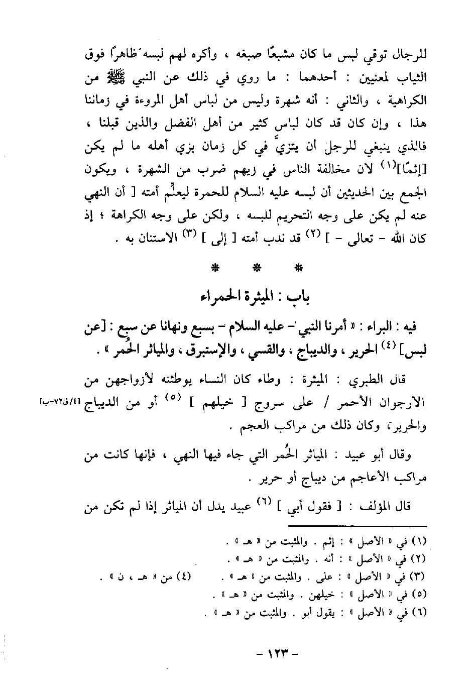 / 53 - فيه: الْبَرَاء، أَمَرَنَا النَّبِى عليه السَّلام: بِسَبْعٍ، وَنَهَانَا عَنْ سَبْعٍ: عَنْ لُبْسِ الْحَرِيرِ، وَالدِّيبَاجِ، وَالْقَسِّىِّ، وَالإسْتَبْرَقِ، وَالْمَيَاثِرِ الْحُمْرِ. قال الطبرى: المثيرة: وطأ كان النساء يوطئه لأزواجهن من الأرجوان الأحمر على سروج خيلهم أو من الديباج والحرير، وكان ذلك من مراكب العجم. قال الطبرى: على سروج خيلهم أو من الديباج والحرير، وكان ذلك من مراكب العجم. وقال أبو عبيد: المياثر الحمر التى جاء فيها النهى، فإنها كانت من مراكب الأعاجم من ديباج أو حرير. قال المؤلف: فقول أبى عبيد يدل أن المياثر إذا لم تكن من
