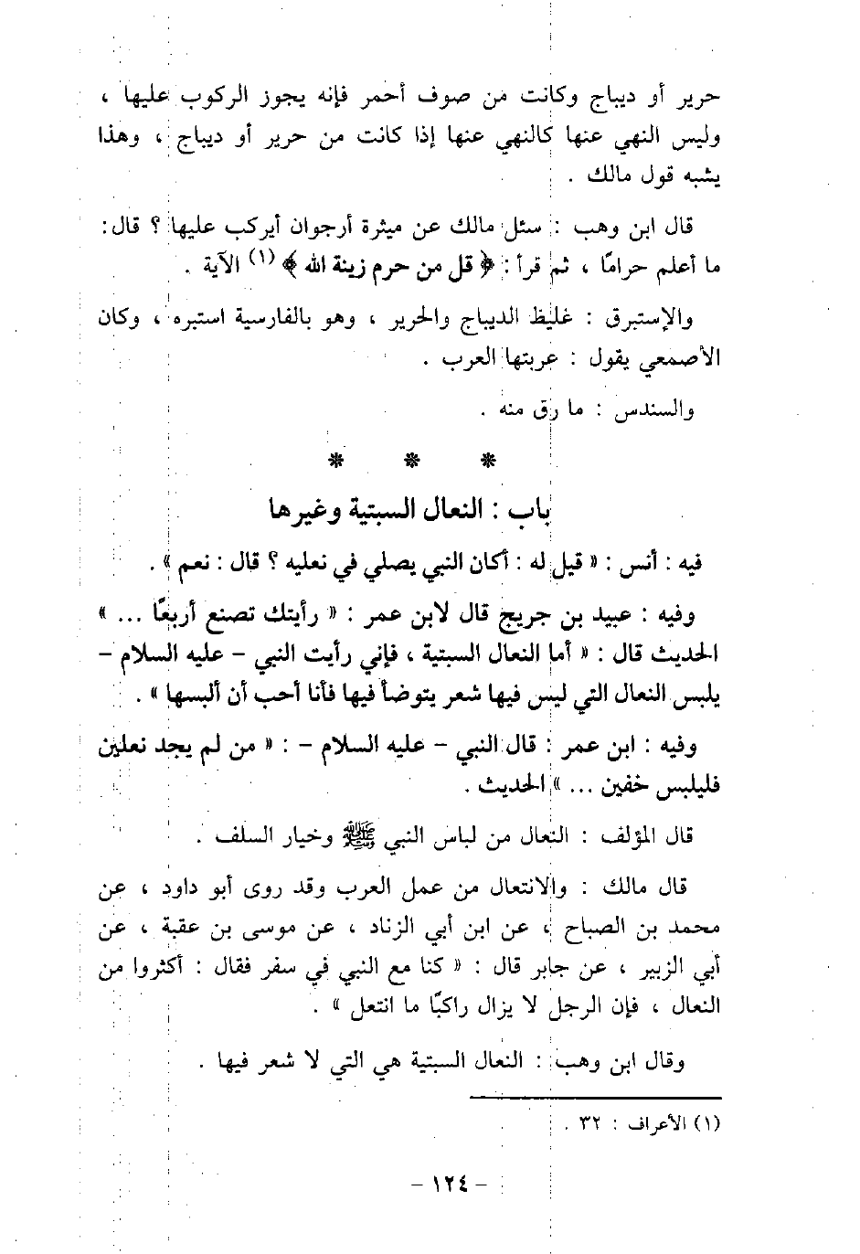 / 54 - فيه: أَنس: قيل له: أَكَانَ النَّبِى (صلى الله عليه وسلم) يُصَلِّى فِى نَعْلَيْهِ؟ قَالَ: نَعَمْ. / 55 - وفيه: عُبَيْدِ بْنِ جُرَيْجٍ، قَالَ لابْن عُمَر: رَأَيْتُكَ تَصْنَعُ أَرْبَعًا. . . . الحديث، قَالَ: أَمَّا النِّعَالُ السِّبْتِيَّةُ، فَإِنِّى رَأَيْتُ النبِىّ، عليه السَّلام، يَلْبَسُ النِّعَالَ الَّتِى لَيْسَ فِيهَا شَعَرٌ وَيَتَوَضَّأُ فِيهَا، فَأَنَا أُحِبُّ أَنْ أَلْبَسَهَا. / 56 - وفيه: ابْن عُمَر، قَالَ: النَّبِىّ، عليه السَّلام: (مَنْ لَمْ يَجِدْ نَعْلَيْنِ فَلْيَلْبَسْ خُفَّيْنِ. . .) الحديث. قال المؤلف: النعال من لباس النبي (صلى الله عليه وسلم) وخيار السلف. قال مالك: والانتعال من عمل العرب وقد روى أبو داود، عن محمد بن الصباح، عن ابن أبى الزناد، عن موسى بن عقبة، عن أبى الزبير، عن جابر قال: (كنا مع النبى فى سفر فقال: أكثروا من النعال، فإن الرجل لا يزال راكبًا ما انتعل) . وقال ابن وهب: النعال السبتية هى التى لا شعر فيها.