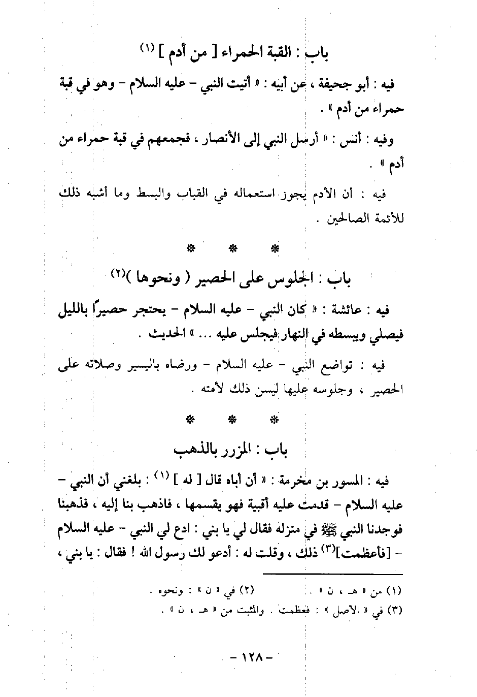 / 61 - فيه: أَبُو جُحَيْفَةَ، عَنْ أَبِيهِ، قَالَ: أَتَيْتُ النَّبِىَّ، عليه السَّلام، وَهُوَ فِى قُبَّةٍ حَمْرَاءَ مِنْ أَدَمٍ. / 62 - وفيه: أَنَس، أَرْسَلَ النَّبِى (صلى الله عليه وسلم) إِلَى الأنْصَارِ، فَجَمَعَهُمْ فِى قُبَّةٍ حَمْرَاءَ مِنْ أَدَمٍ. فيه: أن الأدم يجوز استعماله فى القباب والبسط وماأشبه ذلك للأئمة الصالحين.