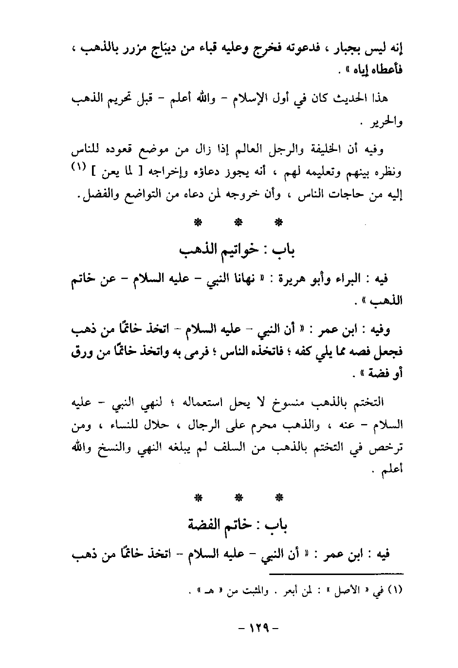 / 65 - فيه: الْبَرَاء وأَبُو هُريرة، نَهَانَا النَّبِي (صلى الله عليه وسلم) عَنْ خَاتَمِ الذَّهَبِ. / 66 - فيه: ابْن عُمَر، أَنَّ النَّبِىّ، عليه السَّلام، اتَّخَذَ خَاتَمًا مِنْ ذَهَبٍ، وَجَعَلَ فَصَّهُ مِمَّا يَلِى كَفَّهُ، فَاتَّخَذَهُ النَّاسُ، فَرَمَى بِهِ، وَاتَّخَذَ خَاتَمًا مِنْ وَرِقٍ، أَوْ فِضَّةٍ. التختم بالذهب منسوج لا يحل استعماله، لنهى النبى، عليه السلام، عنه، والذهب محرم على الرجال، حلال للنساء، ومن ترخص فى التختم بالذهب من السلف لم يبلغه النهى والنسخ والله أعلم.