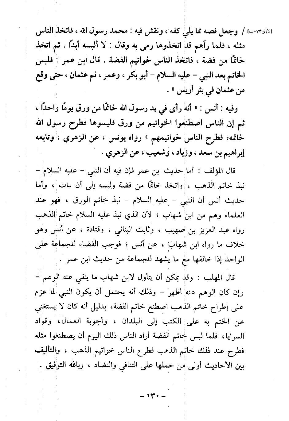 وَجَعَلَ فَصَّهُ مِمَّا يَلِى كَفَّهُ، وَنَقَشَ فِيهِ، مُحَمَّدٌ رَسُولُ اللَّهِ، فَاتَّخَذَ النَّاسُ مِثْلَهُ، فَلَمَّا رَآهُمْ قَدِ اتَّخَذُوهَا رَمَى بِهِ، وَقَالَ: لا أَلْبَسُهُ أَبَدًا، ثُمَّ اتَّخَذَ خَاتَمًا مِنْ فِضَّةٍ، فَاتَّخَذَ النَّاسُ خَوَاتِيمَ الْفِضَّةِ) . قَالَ ابْنُ عُمَرَ: فَلَبِسَ الْخَاتَمَ بَعْدَ النَّبِى (صلى الله عليه وسلم) أَبُو بَكْرٍ، ثُمَّ عُمَرُ، ثُمَّ عُثْمَانُ، حَتَّى وَقَعَ مِنْ عُثْمَانَ فِى بِئْرِ أَرِيسَ. / 68 - وفيه: أَنَس، أَنَّهُ رَأَى فِى يَدِ رَسُولِ اللَّهِ (صلى الله عليه وسلم) خَاتَمًا مِنْ وَرِقٍ يَوْمًا وَاحِدًا، ثُمَّ إِنَّ النَّاسَ اصْطَنَعُوا الْخَوَاتِيمَ مِنْ وَرِقٍ، فَلَبِسُوهَا، فَطَرَحَ رَسُولُ اللَّهِ (صلى الله عليه وسلم) خَاتَمَهُ، فَطَرَحَ النَّاسُ خَوَاتِيمَهُمْ. رواه يونس، عن الزهرى، وتابعه إبراهيم بن سعد، وزياد، وشعيب، عن الزهرى. قال المؤلف: أما حديث ابن عمر فإن فيه أن النبى - عليه السلام - نبذ خاتم الذهب، واتخذ خاتمًا من فضة ولبسه إلى أن مان، وأما حديث أنس أن النبى عليه السلام نبذ خاتم الورق، فهو عند العلماء وهم من ابن شهاب، لأن الذى نبذ عليه السلام خاتم الذهب رواه عبد العزيز بن صهيب، وثابت البنانى، وقتادة، عن أنس وهو خلاف مارواه ابن شهاب، عن أنس، فوجب القضاء للجماعة على الواحد إذا خالفها مه مايشهد للجماعة من حديث ابن عمر. قال المهلب: وقد يمكن أن يتأول لأبن شهاب ماينفى عنه الوهم - وإن كان الوهم عنه أظهر - وذلك أنه يحتمل أن يكون النبى لما عزم على إطراح خاتم الذهب اصطنع خاتم الفضة، بدليل أنه كان لا يستغنى عن الختم به على الكتب إلى البلدان، وأجوبه العمال، وقواد السرايا، فلما لبس خاتم الفضة أراد الناس ذلك اليوم أن يصطنعوا مثله فطرح عند ذلك خاتم الهب فطرح الناس خواتيم الذهب، والتأليف بين الأحاديث أولى من حملها على التنافى والتضاد، وبالله التوفيق.