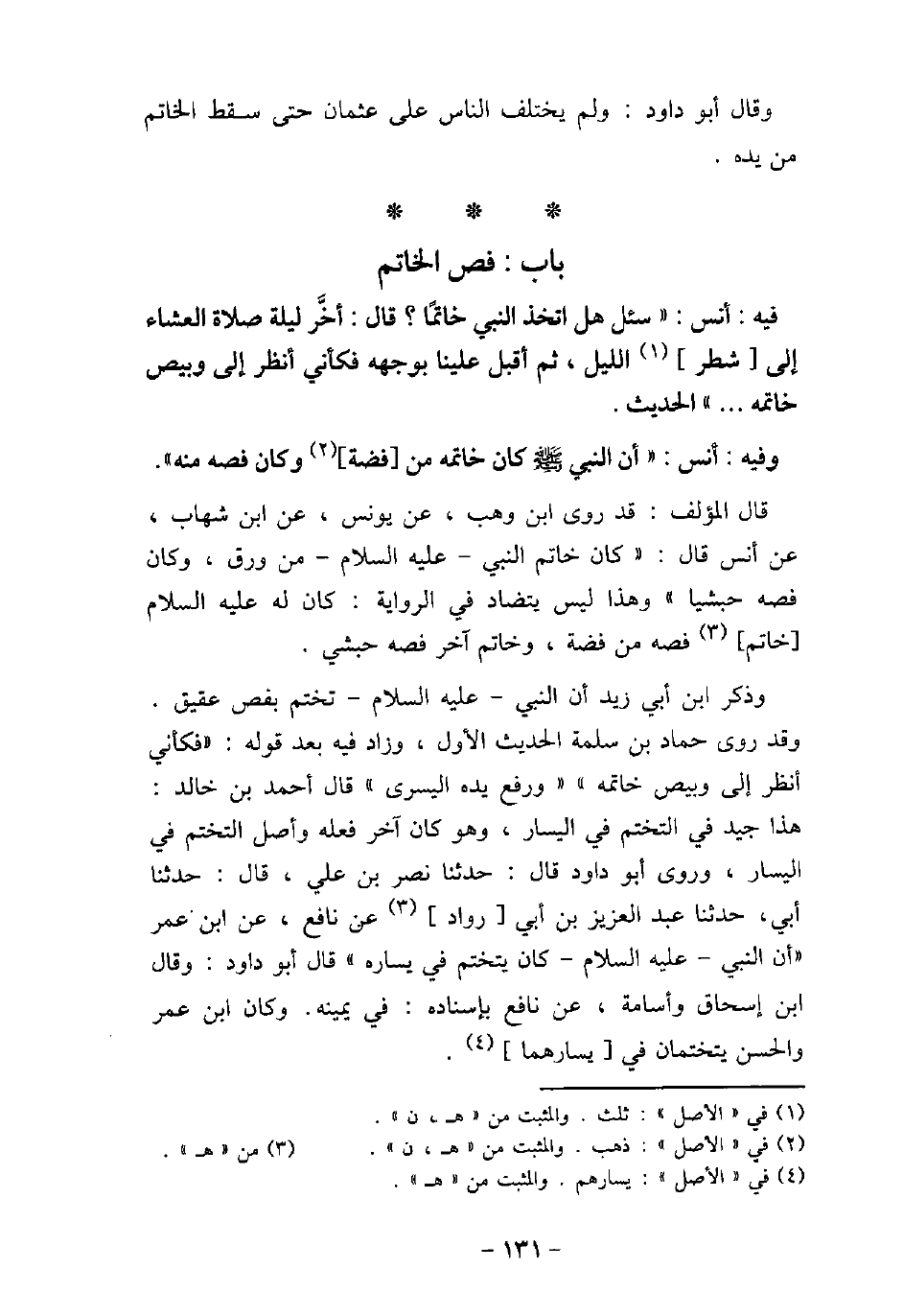 / 69 - فيه: أَنَس، سُئل هَلِ اتَّخَذَ النَّبِىُّ (صلى الله عليه وسلم) خَاتَمًا؟ قَالَ: أَخَّرَ لَيْلَةً صَلاةَ الْعِشَاءِ إِلَى شَطْرِ اللَّيْلِ، ثُمَّ أَقْبَلَ عَلَيْنَا بِوَجْهِهِ، فَكَأَنِّى أَنْظُرُ إِلَى وَبِيصِ خَاتَمِهِ. . . الحديث. / 70 - وفيه: أنس: (أن النبى عليه السلام كان خاتمه من فضة وكان فصه منه) . قال المؤلف: قد روى ابن وهب، عن يونس، عن ابن شهاب، عن أنس قال: (كان خاتم النبى - عليه السلام - من ورق، وكان فصه حبشيًا وهذا ليس يتضاد فى الرواية: كان له عليه السلام خاتم فصه من فضة، وخاتم آخر فصه حبشى. وذكر ابن أبى زيد أن النبى - عليه السلام - تختم بفص عقيق. وقد روى حماد بن سلمه الحديث الأول، وزاد فيه بعد قوله: (فكأنى أنظر إلى وبيض خاتمه) (ورفع يده اليسرى) قال أحمد بن خالد: هذا جيد فى التختم فى اليسار، وهو كان آخر فعله وأصل التختم فى اليسار، وروى أبو داود قال: حديثنا نصر بن على، قال: حدثنا أبى، حدثنا عبد العزيز بن أبى رواد، عن نافع، عن ابن عمر (أن النبى - عليه السلام - كان يتختم فى يساره) قال أبو داود: وقال ابن إسحاق، وأسامة، عن نافع بإسناده: فى يمينه. وكان ابن عمر والحسن يتختمان فى يسارهما.
