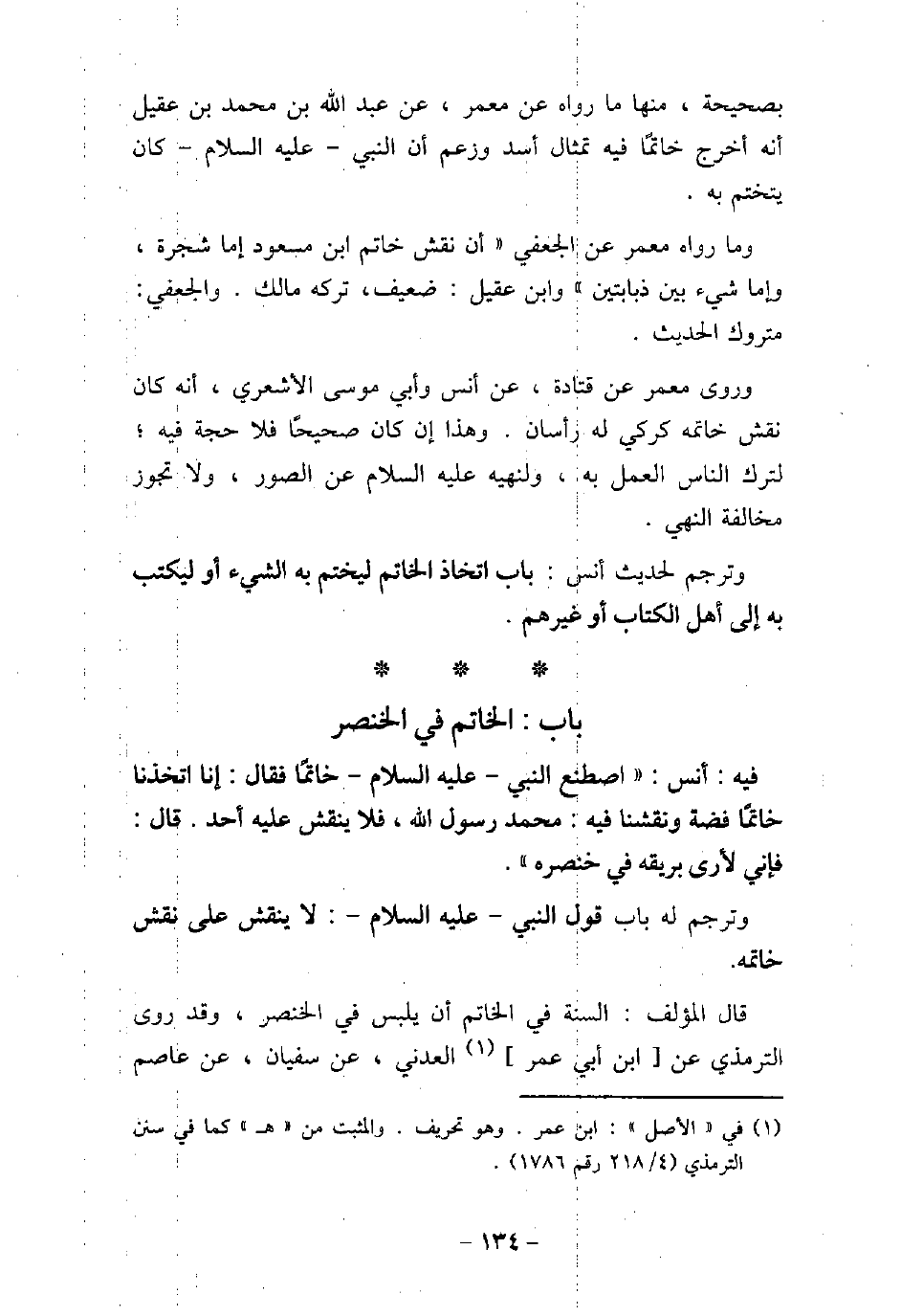 بصحيحه، منها عن معمر، عن عبد الله بن محمد بن عقيل أنه أخرج خاتمًا فيه تمثال اسد وزعم ان النبى - عليه السلام - كان يتختم به. ومارواه معمر عن الجعفى (أن نقش خاتم ابن مسعود إما شجرة، وإما شىء بين ذبابتين) وابن عقيل: ضعيف، تركه مالك. والجعفى: متروك الحديث. وروى معمر عن قتادة، عن أنس موسى الشعرى، أنه كان نقش خاتمه كركى له رأسان. وهذا إن كان صحيحًا فلا حجة فيه، لترك الناس العمل به، ولنهيه عليه السلام عن الصور، ولاتجوز مخالفة النهى. وترجم لحديث أنس: باب اتخاذ الخاتم ليختم به الشىء أو ليكتب به إلى أهل الكتاب أو غيرهم.