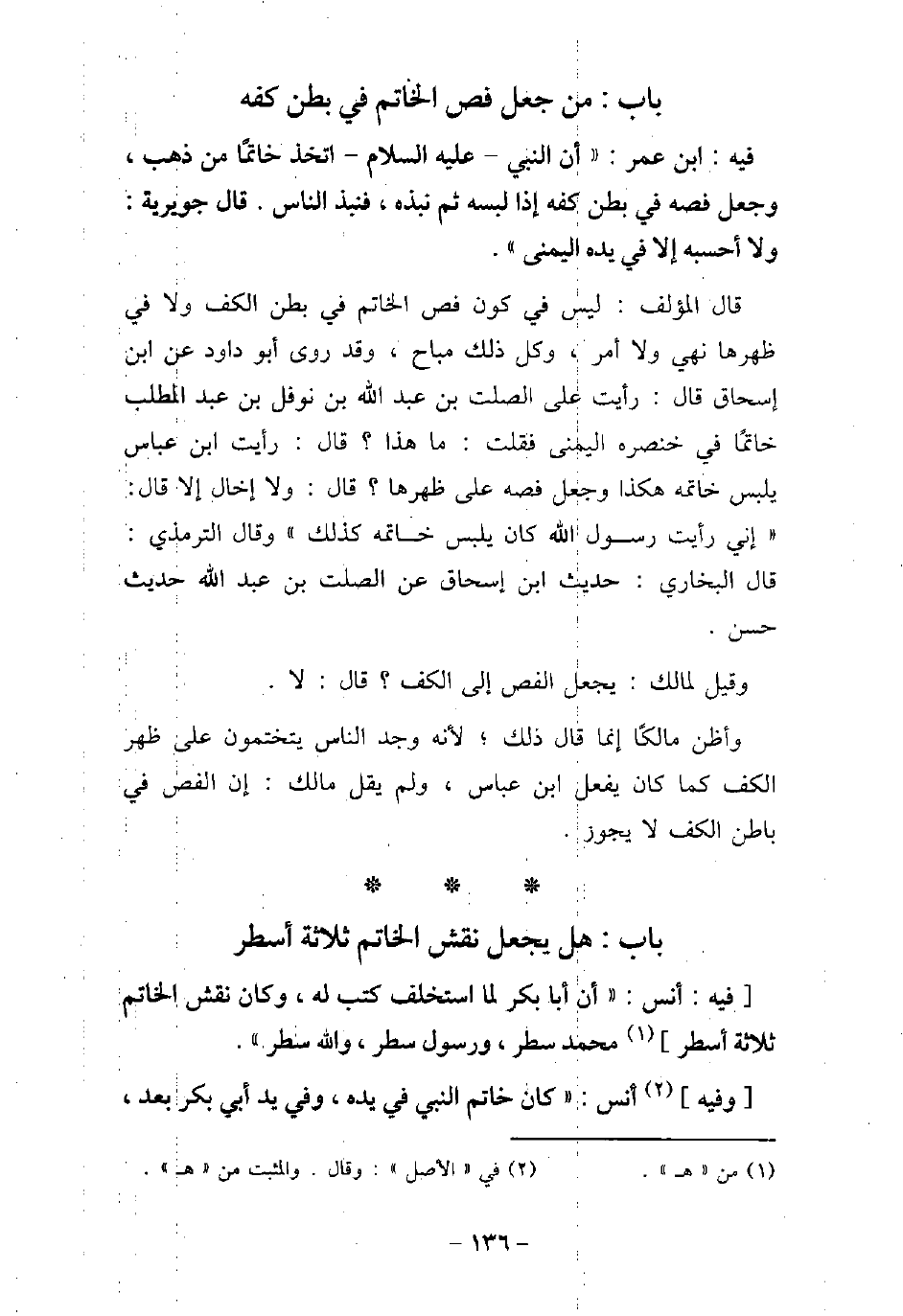 / 76 - فيه: أَنَس، أَنَّ أَبَا بَكْرٍ لَمَّا اسْتُخْلِفَ كَتَبَ لَهُ، وَكَانَ نَقْشُ الْخَاتَمِ ثَلاثَةَ أَسْطُرٍ: مُحَمَّدٌ سَطْرٌ، وَرَسُولُ سَطْرٌ، وَاللَّهِ سَطْرٌ. وفيه: أَنَس، كَانَ خَاتَمُ النَّبِي (صلى الله عليه وسلم) فِى يَدِهِ، وَفِي يَدِ أَبِى بَكْرٍ بَعْدَ،