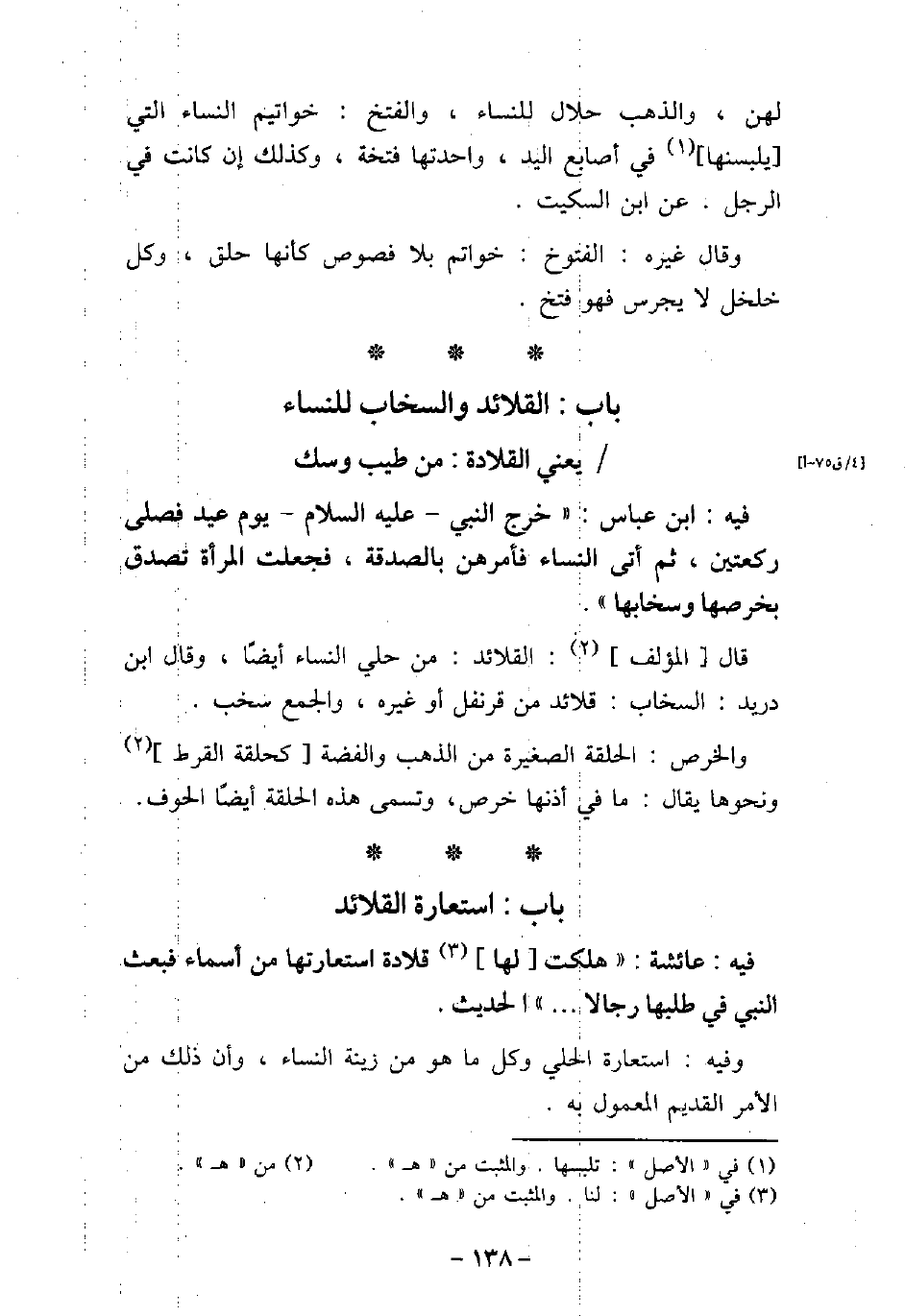/ يعني القلادة: من طيب وسك 78 - فيه: ابْن عَبَّاس، خَرَجَ النَّبِى (صلى الله عليه وسلم) يَوْمَ عِيدٍ فَصَلَّى رَكْعَتَيْنِ، ثُمَّ أَتَى النِّسَاءَ، فَأَمَرَهُنَّ بِالصَّدَقَةِ، فَجَعَلَتِ الْمَرْأَةُ تَصَدَّقُ بِخُرْصِهَا وَسِخَابِهَا. قال المؤلف: القلائد: من حلى النساء أيضًا وقال ابن دريد: السخاب: قلائد من قرنفل أو غيره، والجمع سخب. والخرص: الحلقة الصغيرة من الذهب والفضة كحلقة القرط ونحوها يقال: مافى أذنها خرص، وتسمى هذه الحلقة أيضًا الحوف.