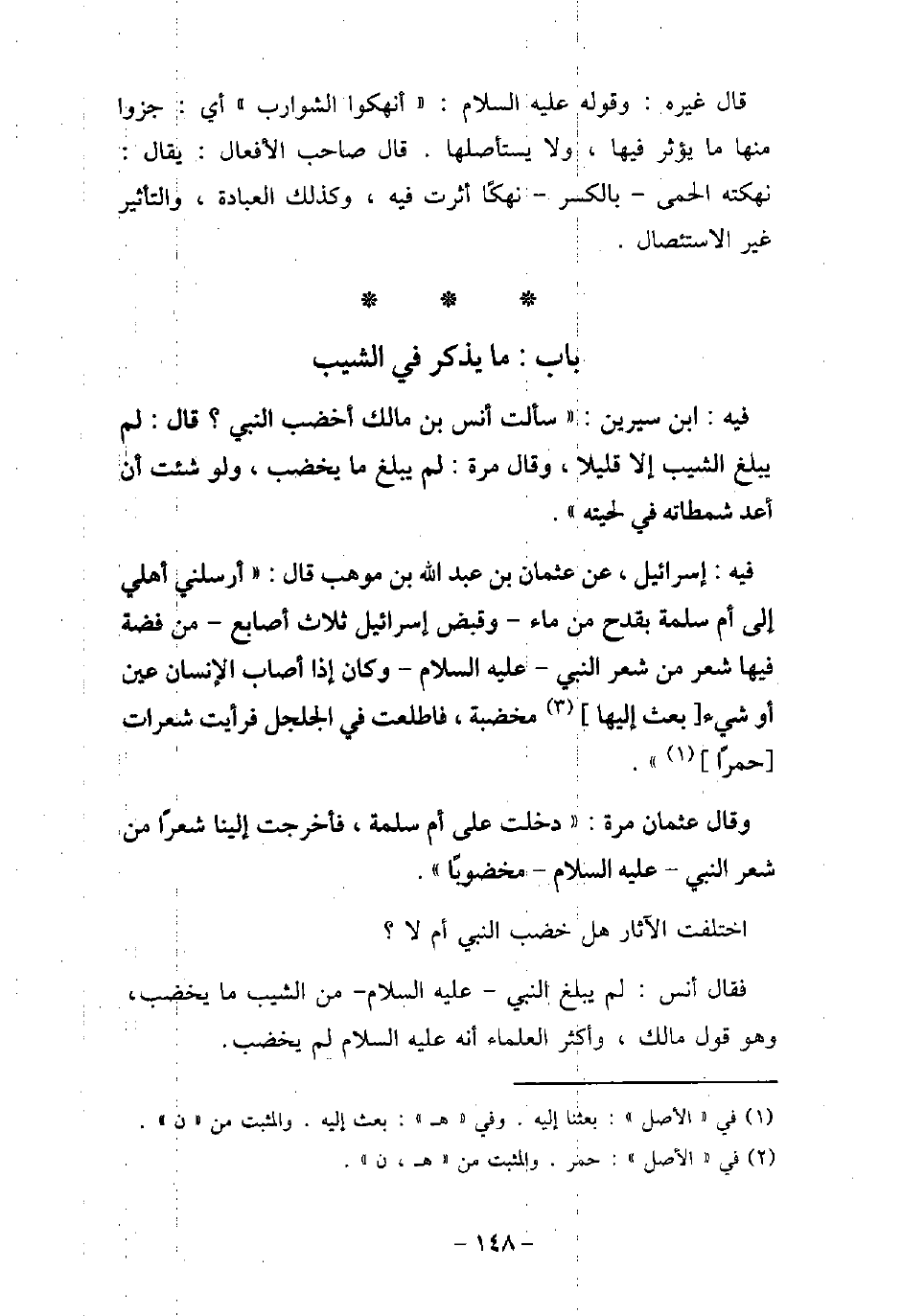 / 88 - فيه: ابْن سِيرِينَ، سَأَلْتُ أَنَس بْن مالك أَخَضَبَ النَّبِى (صلى الله عليه وسلم) ؟ قَالَ: لَمْ يَبْلُغِ الشَّيْبَ إِلا قَلِيلا. وقال مرة: لَمْ يَبْلُغْ مَا يَخْضِبُ، لَوْ شِئْتُ أَنْ أَعُدَّ شَمَطَاتِهِ فِى لِحْيَتِهِ. / 89 - فيه: إِسْرَائِيلُ، عَنْ عُثْمَانَ بْنِ عَبْدِاللَّهِ بْنِ مَوْهَبٍ، قَالَ: أَرْسَلَنِى أَهْلِى إِلَى أُمِّ سَلَمَةَ بِقَدَحٍ مِنْ مَاءٍ، وَقَبَضَ إِسْرَائِيلُ ثَلاثَ أَصَابِعَ مِنْ قُصَّةٍ فِيهِ شَعَرٌ مِنْ شَعَرِ النَّبِى (صلى الله عليه وسلم) ، وَكَانَ إِذَا أَصَابَ الإنْسَانَ عَيْنٌ، أَوْ شَىْءٌ بَعَثَ إِلَيْهَا مِخْضَبَهُ، فَاطَّلَعْتُ فِى الْجُلْجُلِ، فَرَأَيْتُ شَعَرَاتٍ حُمْرًا. / 90 - وَقَالَ عُثْمَان مرة: دَخَلْتُ عَلَى أُمِّ سَلَمَةَ، فَأَخْرَجَتْ إِلَيْنَا شَعَرًا مِنْ شَعَرِ النَّبِى (صلى الله عليه وسلم) مَخْضُوبًا. اختلف الاثار هلى خضب النبى أم لا؟ فقال أنس: لم يبلغ النبى عليه السلام من الشيب مايخضب وهو قول مالك، وأكثر العلماء أنه عليه السلام لم يخضب.