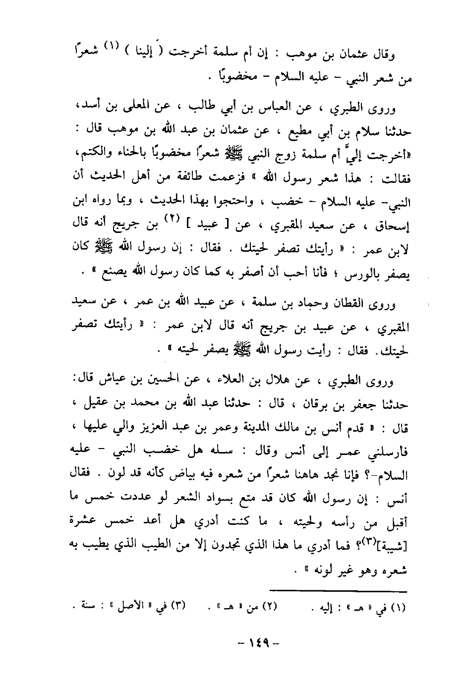 وقال عثمان بن موهب: إن أم سلمه أخرجت إلينا شعرًا من شعر النبى - عليه السلام - مخضوبًا. وروى الطبرى، عن العباس بن أبى طالب، عن المعلى بن أسد حدثنا سلام بن أبى مطيع، عن عثمان بن عبد الله بن موهب قال: (أخرجت إلى أم سلمه زوج النبي (صلى الله عليه وسلم) شعرًا مخضوبًا بالحناء والكتم، فقالت: هذا شعر رسول الله) فزعمت طائفة من أهل الحديث أن النبى - عليه السلام - خضب، واحتجوا بهذا الحديث، وبما رواه ابن إسحاق، عن سعيد المقبرى، عن عبيد بن جريح أنه قال لابن عمر: (رأيتك تصفر لحيتك. فقال: إن رسول الله عليه السلام كان يصفر بالورس، فأنا أحب أن أصفر به كما كان رسول الله يصنع) . وروى القطان وحماد بن سلمه، عن عبيد الله بن عمر، عن سعيد المقبرى، عن عبيد بن جريح أنه قال لابن عمر: (رأيتك تصفر لحيتك. فقال: رايت رسول الله عليه السلام يصفر لحيته) . وروى الطبرى، عن هلال بن العلاء، عن الحسين بن عياش قال حدثنا جعفر بن برقان، قال: حدثنا عبد الله بن محمد بن عقيل، قال: (قدم أنس بن مالك المدينة وعمر بن عبد العزيز وإلى عليها، فأرسلنى عمر إلى أنس وقال: سله هل خضب النبى - عليه السلام -؟ فإنا نجد هاهنا شعرًا من شعره فيه بياض كأنه قد لون. فقال أنس: إن رسول الله كان قد متع بسواد الشعر لو عددت خمس ما أقبل من راسه ولحيته، وماكنت أدرى عل أعد خمس عشرة شيبه فما أدرى ما هذا الذى تجدون إلا من الطيب الذى يطيب به شهره وهو غير لونه) .