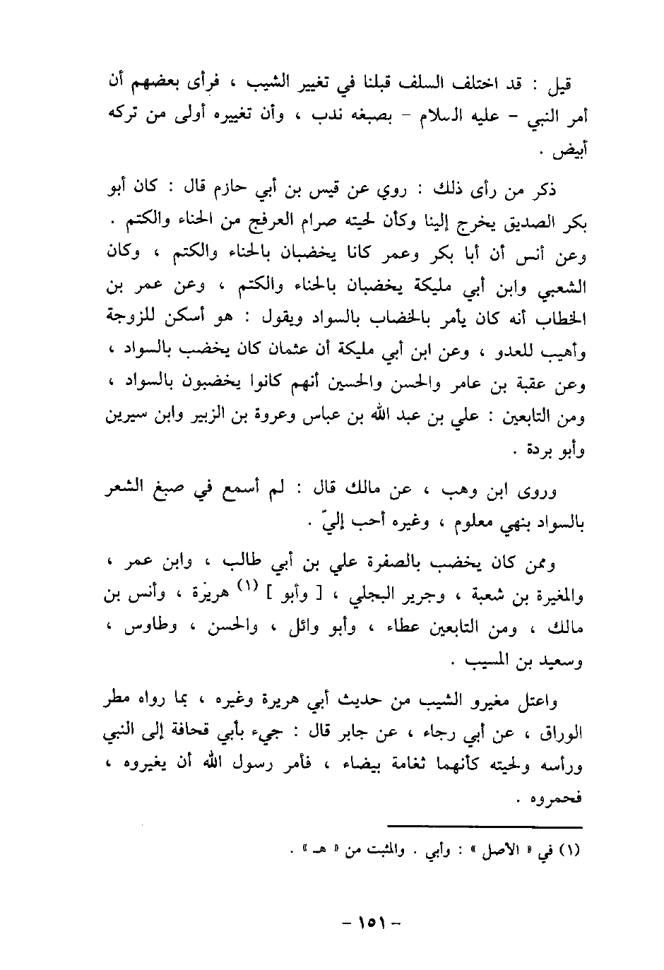 قيل: قد اختلف السلف قبلنا فى تغيير الشيب، فرأى بعضهم أن أمر النبى - عليه السلام - بصبغه ندب، وأن تغييره أولى من تركه أبيض. ذكر من رأى ذلك: روى عن قيس بن أبى حازم قال: كان أبو بكر الصديق يخرج إلينا وكأن لحيته صرام العرفج من الحناء والكتم. وعن أنس أن أبا بكر وعمر كان يخضبان بالحنان والكتم، وكان الشعبى وابن أبى مليكة يخضبان بالسواد ويقول: هو اسكن للزوجة وأهيب للعدو، وعن أبن مليكة أن عثمان كان يخضب بالسواد، وعن عقبة بن عامر والحسن والحسين أنهم كانوا يخضبون بالسواد، ومن التابعين: على بن عبد الله بن عباس وعروة بن الزبير وابن سيرين وأبو برده. وروى ابن وهب، عن مالك قال: لم أسمع فى صبغ الشعر بالسواد بنهى معلوم، وغيره أحب إلى. وممن كان يخضب بالصفرة على بن أبى طالب، وابن عمر، والمغيرة بن شعبة، وجرير البجلى، وأبو هريرة، وأنس بن مالك، ومن التابعين عطاء، وأبو وائل، والحسن، وطاوس، وسعيد بن المسيب. واعتل مغيرو الشيب من حديث أبى هريرة وغيره، بما رواه مطر الوراق، عن أبى رجاء، عن جابر قال: جيء بأبى قحافة إلى النبي ورأسه ولحيته كأنهما ثغامة بيضاء، فأمر رسول الله أن يغيروه، فحمروه.