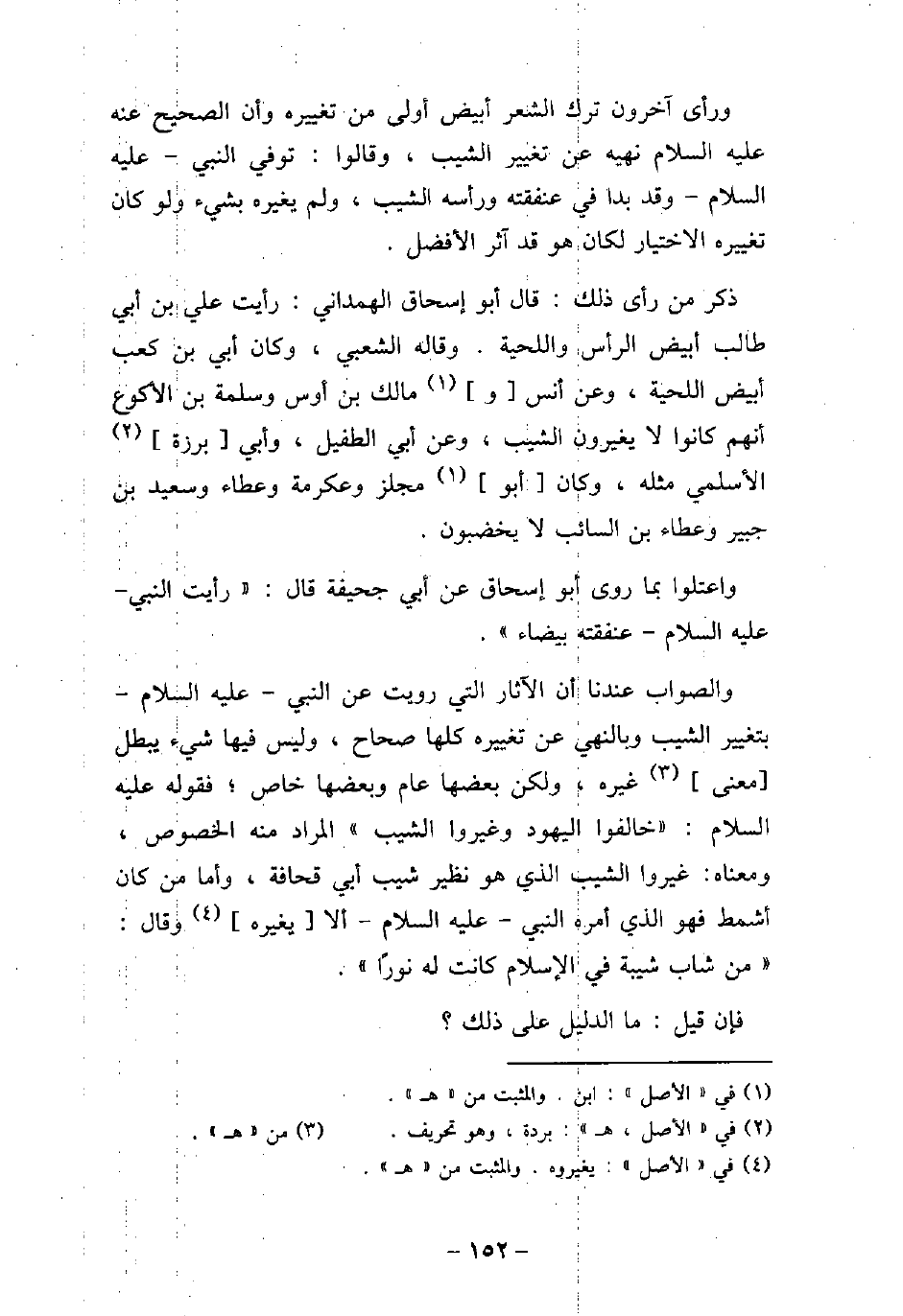 ورأى آخرون ترك الشعر أبيض من تغييره وأن الصحيح عنه عليه السلام نهيه عن تغييره الشيب، وقالوا: توفى النبى عليه السلام وقد بدا فى عنفقه ورأسه الشيب، ولم يغيره بشىء ولو كان تغييره الاختيار لكان هو قد آثر الأفضل. ذكر من راى ذلك: قال أبو إسحاق الهمدانى: رايت على بن أبى طالب ابيض الرأس واللحية. وقاله الشعبى، وكان أبى بن كعب ابيض اللحية، وعن أنس، ومالك بن أوس وسلمه بن الأكوع أنهم كانوا لا يغيرون الشيب، وعن أبى الطفيل، وأبى برزة السلمى مثله، وكان أبو مجلز وعكرمة وعطاء وسعيد بن جبير وعطاء بن السائب لا يخضبون. واعتلوا بما روى أبو إسحاق عن أبى جحيفة قال: (رايت النبى عليه السلام عنفقه بيضاء) . والصواب عندنا الآثار التى رويت عن النبى عليه السلام بتغيير الشيب وبالنهى عن تغييره كلها صحاح، وليس فيها شىء يبطل معنى غيره، ولكن بعضها عام وبعضها خاص، فقوله عليه السلام: (خالفوا اليهود وغيروا الشيب) المراد منه الخصوص، ومعناه: غيروا الشيب الذى هو نظير شيب أبى قحافة، وأما من كان اشمط فهو الذى أمره النبى عليه السلام ألا يغيره وقال: (من شاب شيبة فى الإسلام كانت له نورًا) . فإن قيل: مالدليل على ذلك؟