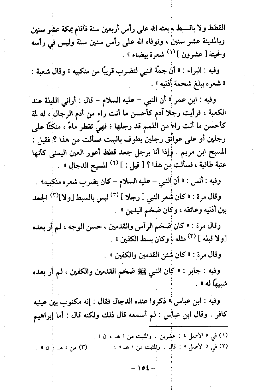 الْقَطَطِ، وَلا بِالسَّبْطِ، بَعَثَهُ اللَّهُ عَلَى رَأْسِ أَرْبَعِينَ سَنَةً، فَأَقَامَ بِمَكَّةَ عَشْرَ سِنِينَ، وَبِالْمَدِينَةِ عَشْرَ سِنِينَ، وَتَوَفَّاهُ اللَّهُ عَلَى رَأْسِ سِتِّينَ سَنَةً، وَلَيْسَ فِى رَأْسِهِ وَلِحْيَتِهِ عِشْرُونَ شَعَرَةً بَيْضَاءَ. / 93 - وفيه: الْبَرَاء، إِنَّ جُمَّةَ النَّبِىّ (صلى الله عليه وسلم) لَتَضْرِبُ قَرِيبًا مِنْ مَنْكِبَيْهِ. وَقَالَ شُعْبَةُ: شَعَرُهُ يَبْلُغُ شَحْمَةَ أُذُنَيْهِ. / 94 - وفيه: ابْن عُمَر، أَنَّ النَّبِىّ (صلى الله عليه وسلم) قَالَ: (أُرَانِى اللَّيْلَةَ عِنْدَ الْكَعْبَةِ، فَرَأَيْتُ رَجُلا آدَمَ كَأَحْسَنِ مَا أَنْتَ رَاءٍ مِنْ أُدْمِ الرِّجَالِ، لَهُ لِمَّةٌ كَأَحْسَنِ مَا أَنْتَ رَاءٍ مِنَ اللِّمَمِ، قَدْ رَجَّلَهَا فَهِىَ تَقْطُرُ مَاءً، مُتَّكِئًا عَلَى رَجُلَيْنِ - أوْ عَلَى عَوَاتِقِ رَجُلَيْنِ - يطُوفُ بِالْبَيْتِ، فَسَأَلْتُ مَنْ هَذَا؟ فَقِيلَ: الْمَسِيحُ ابْنُ مَرْيَمَ، وَإِذَا أَنَا بِرَجُلٍ جَعْدٍ قَطَطٍ أَعْوَرِ الْعَيْنِ الْيُمْنَى، كَأَنَّهَا عِنَبَةٌ طَافِيَةٌ، فَسَأَلْتُ: مَنْ هَذَا؟ فَقِيلَ: الْمَسِيحُ الدَّجَّالُ) . / 95 - وفيه: أَنَس، أَنَّ النَّبِى (صلى الله عليه وسلم) كَانَ يَضْرِبُ شَعَرُهُ مَنْكِبَيْهِ. / 96 - فيه: وَقَالَ مرة: كَانَ شَعَرِ النَّبِىّ (صلى الله عليه وسلم) رَجِلا، لَيْسَ بِالسَّبِطِ وَلا الْجَعْدِ، بَيْنَ أُذُنَيْهِ وَعَاتِقِهِ. وَكَانَ ضَخْمَ الْيَدَيْنِ. / 97 - وَقَالَ مرة: كَانَ ضَخْمَ الرأس وَالْقَدَمَيْنِ، حَسَنَ الْوَجْهِ، لَمْ أَرَ بَعْدَهُ وَلا قَبْلَهُ مِثْلَهُ، وَكَانَ بَسِطَ الْكَفَّيْنِ. / 98 - وَقَالَ مرة: كَانَ شَثْنَ الْقَدَمَيْنِ وَالْكَفَّيْنِ. / 99 - وفيه: جَابِر، كَانَ النَّبِى (صلى الله عليه وسلم) ضَخْمَ الْقَدَمَيْنِ وَالْكَفَّيْنِ، وَلَمْ أَرَ بَعْدَهُ شَبَهًا لَهُ. / 100 - وفيه: ابْن عَبَّاس، ذَكَرُوا عنده الدَّجَّالَ، فَقَالَ: إِنَّهُ مَكْتُوبٌ بَيْنَ عَيْنَيْهِ كَافِرٌ. وَقَالَ ابْنُ عَبَّاسٍ: لَمْ أَسْمَعْهُ قَالَ ذَاكَ، وَلَكِنَّهُ قَالَ: (أَمَّا إِبْرَاهِيمُ،