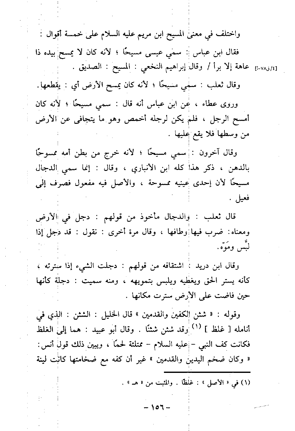 واختلف فى معنى المسيح ابن مريم عليه السلام على خمسة أقوال: فقال ابن عباس: سمى عيسى مسيحًا، لأنه كان لا يمسح بيده ذا عاه إلا برا، وقال إبراهيم النخعى: المسيح: الصديق. وقال ثعلب: سمى مسيحًا، لأنه كان يمسح الأرض أى: يقطعها. وروى عطاء، عن ابن عباس أنه قال: سمى مسيحًا، لأنه كان أمسح الرجل، فلم يكن لرجله أخمص وهو مايتجافى عن الأرض من وسطها فلا يقع عليها. وقال آخرون: سمى مسيحًا، لأنه خرج من بطن أمه مسموحًا بالدهن، ذكر هذا كله ابن الأنبارى، وقال: إنما سمى الدجال مسحًا لأن إحدى عينيه مسوحة، والأصل فيه مفعول فصرف إلى فعيل قال ثعلب: والدجال مأخوذ من قولهم: دجل فى الرض ومعناة: ضرب فيها وطافها، وقال مرة أخرى: نقول: قد دجل إذا لبسّ وموهّ. وقال ابن دريد: اشتقاقه من قولهم: دجلت الشىء إذا سترته، كأن يستر الحق ويغطيه ويلبس بتمويهه، ومنه سميت: دجلة كأنها جين فاضت على الأرض سترت مكانها. وقوله: (شثن الكفين والقدمين) قال الخليل: الثن: الذى فى أنامله غلظ وقد شثن شثنًا. وقال أبو عبيد: هما إلى الغلظ فكانت كف النبى - عليه السلام - ممتلئة لحمًا، ويبين ذلك قول أنس: (وكان ضخم اليدين والقدمين) غير أن كفه مع ضخامتها كانت لينة