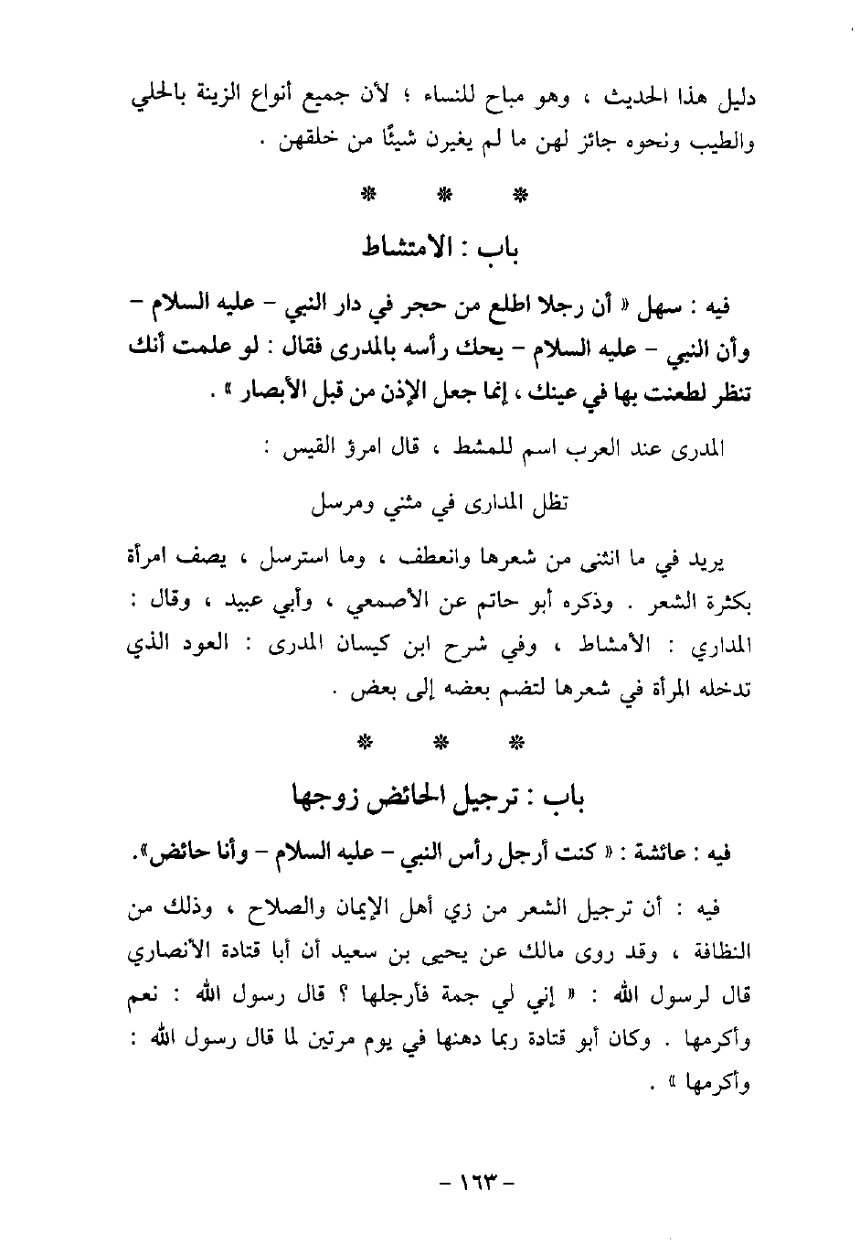 / 110 - فيه: عَائِشَةَ، كُنْتُ أُرَجِّلُ رَأْسَ النَّبِىّ (صلى الله عليه وسلم) وَأَنَا حَائِضٌ. فيه: أن ترجيل الشعر منزى أهل الإيمان والصلاح، وذلك من النظافة، وقد روى مالك عن يحى بن سعيد أن قتادة الأنصارى قال لرسول الله: (إنى لى جمة فارجلها؟ قال رسول الله: نعم وأكرمها. وكان أبو قتادة ربما دهنها فى يوم مرتين لما قال رسول الله: وأكرمها) .