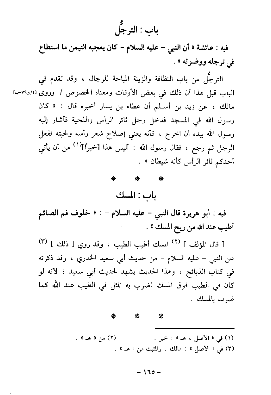 / 111 - فيه: عَائِشَةَ، أَن النَّبِىِّ، عليه السَّلام، كَانَ يُعْجِبُهُ التَّيَمُّنُ مَا اسْتَطَاعَ فِى تَرَجُّلِهِ وَوُضُوئِهِ. الترجلّ من باب النظافة والزينة المباحة للرجال، وقد تقدم فى الباب قبل هذا أن ذلك فى بعض الأوقات ومعناه الخصوص وروى مالك، عن زيد بن أسلم أن عطاء بن يسار أخبره قال: (كان رسول الله فى المسجد فدخل رجل ثائر الراس واللحية فاشار إليه رسول الله بيده أن أخرج، كأنه يعنى إصلاح شعر رأسه ولحيته ففعل الرجل ثم رجع، فقال رسول الله: اليس هذا خيرًا من أن أحدكم ثائر الراس كأنه شيطان) .