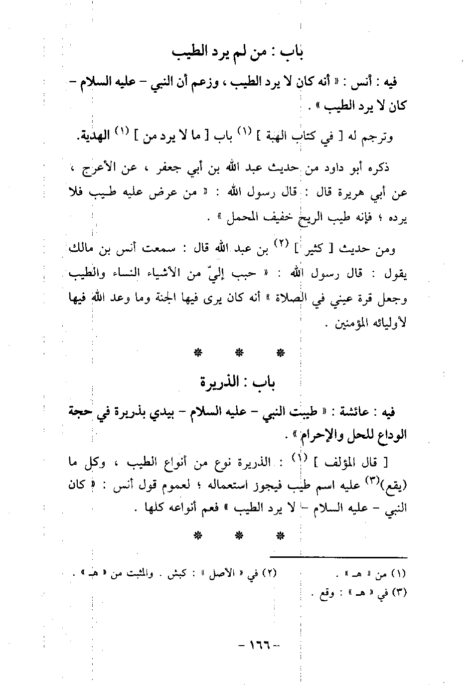 / 113 - فيه: أَنَس، أَنَّهُ لا يَرُدُّ الطِّيبَ، وَزَعَمَ أَنَّ النَّبِى (صلى الله عليه وسلم) كَانَ لا يَرُدُّ الطِّيبَ. وترجم له فى كتاب الهبة باب ما لا يرد من الهدية. ذكره أبو داود من حديث عبد الله بن أبى جعفر، عن الأعرج، عن أبى هريرة قال: قال رسول الله: (من عرض عليه طيب فلا يرده، فإنه طيب الريح خفيف المحمل) . ومن حديث كثير بن عبد الله قال: سمعت أنس بن مالك يقول: قال رسول الله: (حبب إلى من الشياء النساء والطيب وجعل قرة عينى فى الصلاة) أنه كان يرى فيها الجنة وماوعد الله فيها لأوليائه المؤمنين.