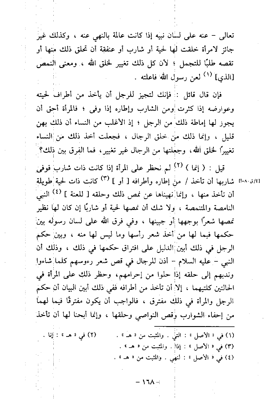 تعالى عنه على لسان نبيه إذا كانت عالمة بالنهى عنه، وكذلك غير جائز لامرأة خلقت لها لحية أو شارب أو عنفقه أن تحلق ذلك منها أو تقصه طلبًا للتجمل، لأن كل ذلك تغيير لخلق الله، ومعنى النص الذى لعن رسول الله فاعلته. فإن قال قائل: فإنك لتجيز للرجل أن يأخذ من أطراف لحيته وعوارضه إذا كثرت ومن الشارب وإطاره إذا وفى، فالمرأة أحق أن يجوز لها إماطة ذلك من الرجل، إذ الأغلب من النساء أن ذلك بهن قليل، وإنما ذلك من خلق الرجال، فجعلت أخذ ذلك من النساء تغييرًا لخلق الله، وجعلتها من الرجال غير تغيير، فما الفرق بين ذلك؟ قيل: إنما لم نحظر على المرأة إذا كانت ذات شارب فوفى شاربها أن تأخذ من إطاره وأطرافه أو كانت ذات لحية طويلة أن تأخذ منها، وإنما نهيناها عن نمص ذلك وحلقة للعنة النبى النامصة والمتنمصة، ولاشك أن نمصها لحية أو شاربًا إن كان لها نظير نمصها شعرًا بزجهها أو جبينها، وفى فرق الله على لسان رسوله بين حكمها فيما لها من أخذ شعر راسها وماليس لها منه، وبين حكم الرجل فى ذلك أبين الدليل على افتراق حكمها فى ذلك، وذلك أن النبى - عليه السلام - أذن للرجال فى قص شعر رؤوسهم كلما شاءوا وندبهم إلى حلقة إذا حلوا من إحرامهم، وحظر ذلك على المرأة فى الحالتين كلتيهما، إلا أن تأخذ من أطرافه ففى ذلك أبين البيان أن حكم الرجل والمرأة فى ذلك مفترق، فالواجب أن يكون مفترقًا فيما لهما من إحفاء الشوارب وقص النواصى وحلقها، وإنما أبحنا لها أن تأخذ