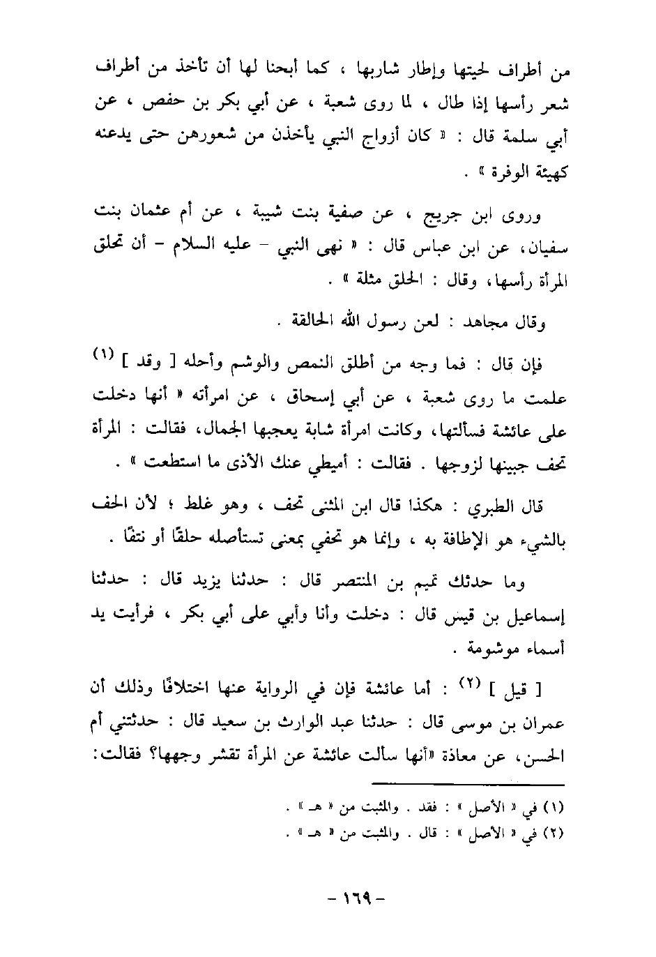 من أطراف لحيتها وإطار شاربها، كما ابحنا لها أن تأخذ من أطراف شعر رأسها إذا طال، لما روى شعبه، عن أبى بكر بن حفص، عن أبى سلمه قال: (كان أزواج النبى يأخذن من شعورهن حتى يدعنه كهيئة الوفرة) . وروى ابن جريح، عن صفيه بنت شيبة، عن أم عثمان بنت سفيان، عن ابن عباس قال: (نهى النبى عليه السلام أن تحلق المرأة رأسها، وقال: الحلق مثله) . وقال مجاهد: لعن رسول الله الحالقة. فإن قال: فما وجه من أطلق النمص والوشم، وأحله وقد علمت ما روى شعبه، عن أبى إسحاق، عن امرأته (أنها دخلت على عائشة فسالتها، وكانت امرأة شابة يعجبها الجمال، فقالت: المرأة تحف جبينها لزوجها. فقالت: أميطى عنك الأذى ما استطعت) . قال الطبرى: هكذا قال ابن المثنى تحف، وهو غلط، لأن الحف بالشىء هو الإطافة به، وإنما هو تحفى بمعنى تستأصله حلقًا أو نتفًا. وما حدثك تميم بن المنتصر قال: حدثنا يزيد قال: حدثنا إسماعيل بن قيس قال: دخلت وأنا وأبى على أبى بكر، فرأيت يد أسماء موشومة. قيل: أما عائشة فإن فى الرواية عنها اختلافًا وذلك أن عمران بن موسى قال: حدثنا عبد الوارث بن سعيد قال: حدثتنى أم الحسن، عن معاذة (أنها سالت عائشة عن المرأة تقشر وجهها؟ فقالت: