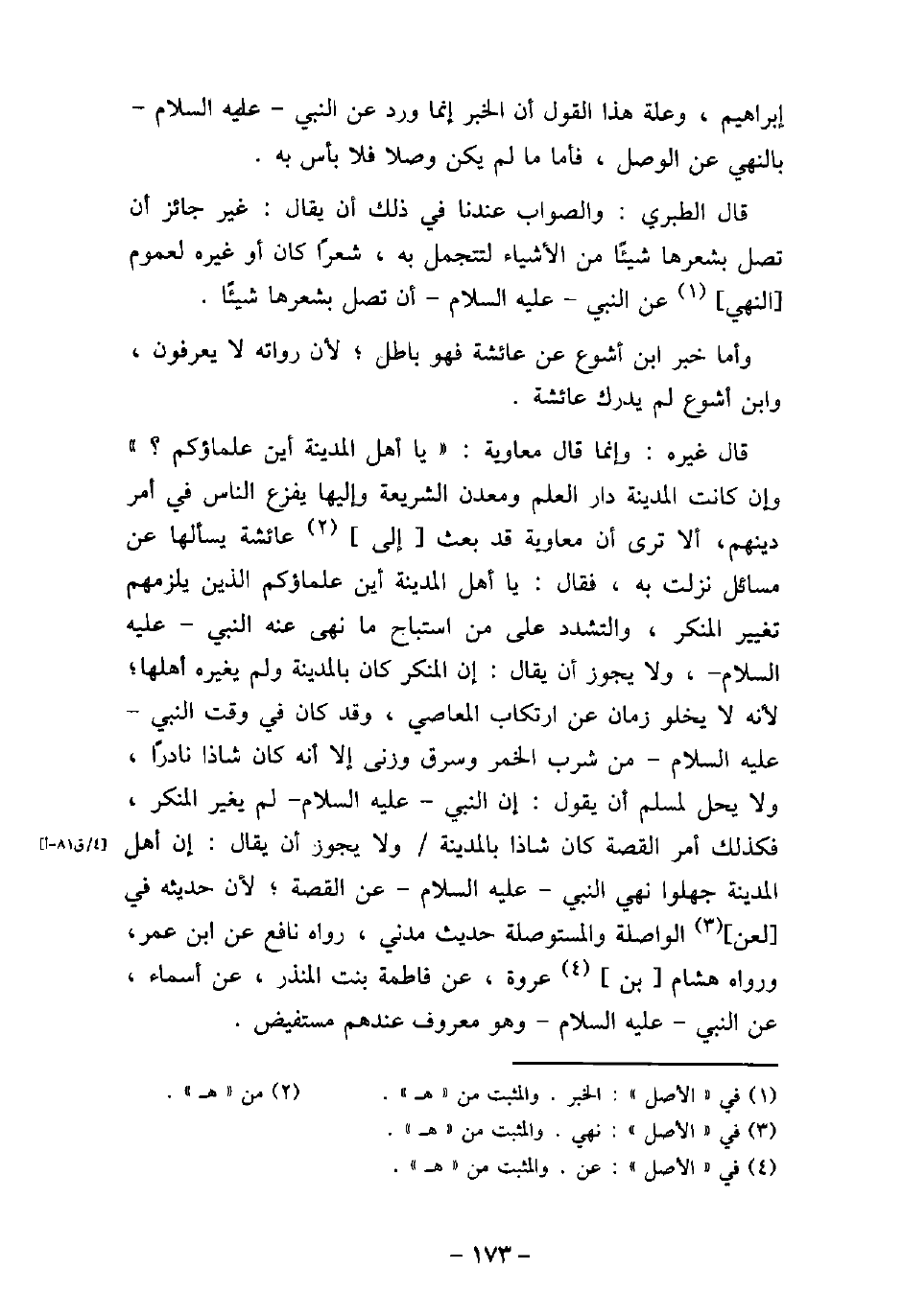 إبراهيم، وعلة هذا القول ان الخبر إنما ورد عن النبى عليه السلام بالنهى عن الوصل، فأما مالم يكن وصلا فلا باس به. قال الطبرى: والصواب عندنا فى ذلك أن يقال: غير جائز أن تصل بشعرها شيئًا من الشياء لتتجمل به، وشعرًا كان أو غيره لعموم النهى عن النبى عليه السلام أن تصل بشعرها شيئًا. وأما خبر اشوع عن عائشة فهو باطل، لأن رواته لا يعرفون، وابن اشوع لم يدرك عائشة. قال غيره: وإنما قال معاوية: (يا أهل المدينة أين علماؤكم؟) وإن كانت المدينة دار العلم ومعدن الشريعة وإليها يفزع الناس فى أمر دينهم ألا ترى أن معاوية قد بعث إلى عائشة يسألها عن مسائل نزلت به، فقال: يا أهل المدينة أين علماؤكم الذين يلزمهم تغيير المنكر، والتشدد على استباح مانهى عنه النبى عليه السلام ولايجوز أن يقال: إن المنكر كان بالمدينة ولم يغيره أهلها، لأنه لا يخلو زمان عن ارتكاب المعاصى، وقد كان فى وقت النبى عليه السلام من شرب الخمر وسرق وزنى إلا أنه كان شاذا نادرًا، ولايحل لمسلم أن يقول: إن النبى عليه السلام لم يغير المنكر، فكذلك أمر القصة كان شاذًا بالمدينة ولا يجوز أن يقال: أن أهل المدينة جهلوا نهى النبى - عليه السلام - عن القصة، لأن حديثه فى لعن الواصلة والمستوصلة حديث مدنى، رواه نافع عن ابن عمر، ورواه هشام بن عروه، عن فاطمة بنت المنذر، عن أسماء، عن النبى - عليه السلام - وهو معروف عندهم مستفيض.