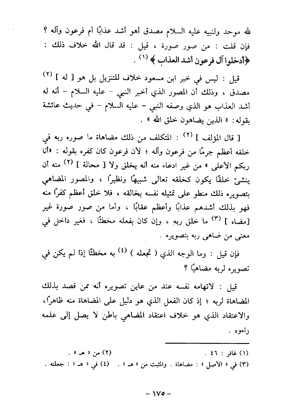 لله موحد ولنبيه عليه السلام مصدق أهو اشد عذابًا أم فرعون وآله؟ فإن قلت: من صور صورة، قيل: قد قال الله خلاف ذلك: (أدخلوا آل فرعون أشد العذاب (. قيل: ليس فى خبر ابن مسعود خلاف للتنزيل بل هو له مصدق، وذلك أن المصور الذى أخبر النبى عليه السلام أنه له أشد العذاب هو الذى وصفه النبى عليه السلام - فى حديث عائشة بقوله: (الذين يضاهون خلق الله) . قال المؤلف: المتكلف من ذلك مضاهاة ماصوره ربه فى خلقه أعظم جرمًا من فرعون وآله، لأن فرعون كان كفره بقوله: (أنا ربكم الأعلى) من غير إدعاء منه أنه يخلق ولا محالة منه أن ينشىء خلقا يكون كخلقه تعالى شبيهًا ونظيرًا، والمصور المضاهى بتصويره ذلك منطو على تمثيله نفسه بخالقه، فلا خلق أعظم كفرًا منه فهو بذلك اشادهم عذابا وأعظم عقابًا، وأما من صور صورة غير مضاه ماخلق ربه، وإن كان بفعله مخطئًا، فغير داخل فى معنى من شاهى ربه بتصويره. فإن قيل: ومالوجه الذى تجعله به مخطئًا إذا لم يكن فى تصويرة لربه مضاهيًا؟ قيل: لاتهامه نفسه عند من عاين تصويره أنه ممن قصد بذلك المضاهاة لربه، إذ كان الفعل الذى هو دليل على المضاهاة منه ظاهرًا، والاعتقاد الذى هو خلاف اعتقاد المضاهى باطن لا يصل إلى علمه راءوه.