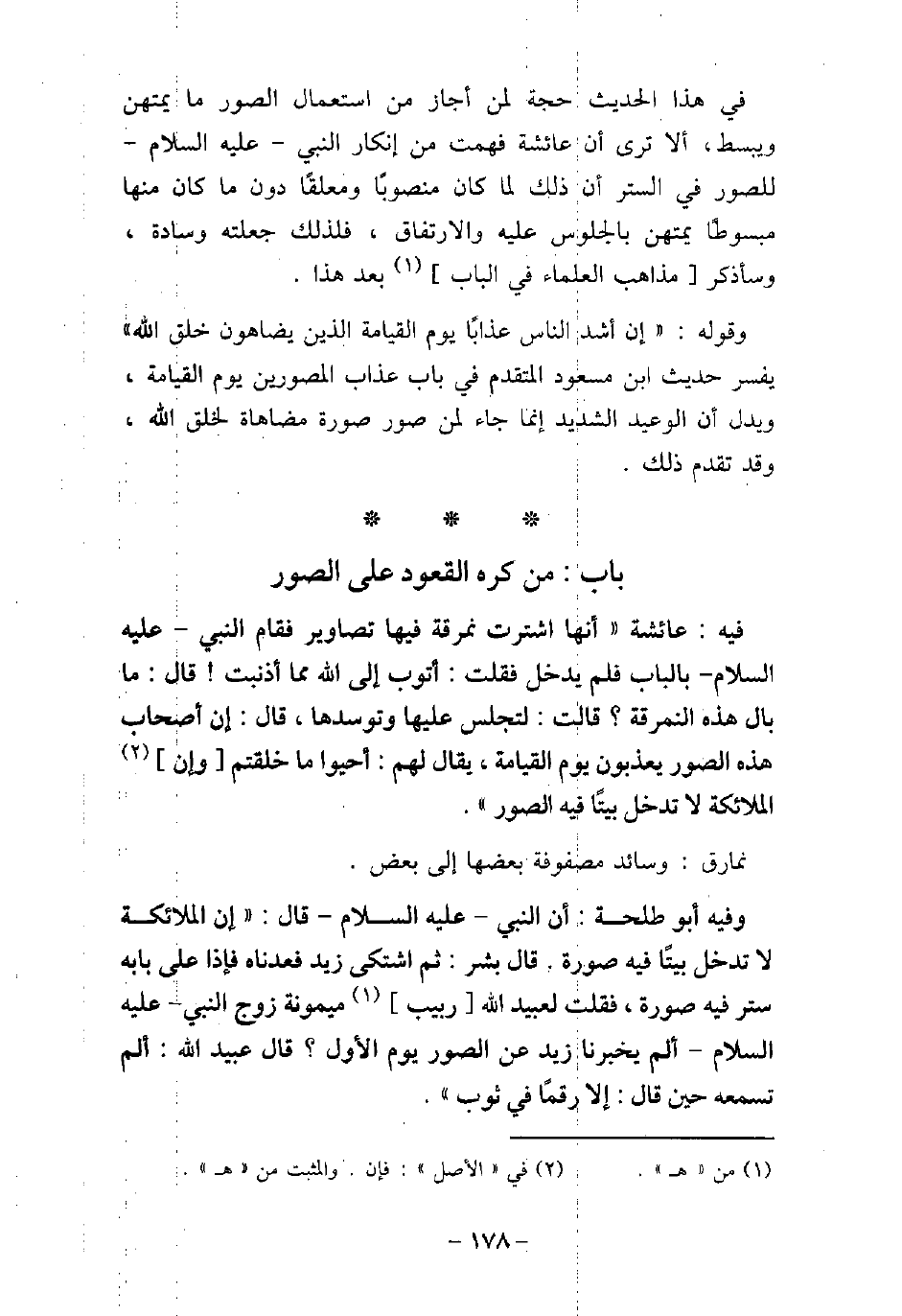 / 128 - فيه: عَائِشَةَ، أَنَّهَا اشْتَرَتْ نُمْرُقَةً فِيهَا تَصَاوِيرُ، فَقَامَ النَّبِى (صلى الله عليه وسلم) بِالْبَابِ، فَلَمْ يَدْخُلْ، فَقُلْتُ: أَتُوبُ إِلَى اللَّهِ مِمَّا أَذْنَبْتُ، قَالَ: مَا هَذِهِ النُّمْرُقَةُ؟ قُلْتُ: لِتَجْلِسَ عَلَيْهَا، وَتَوَسَّدَهَا، قَالَ: (إِنَّ أَصْحَابَ هَذِهِ الصُّوَرِ يُعَذَّبُونَ يَوْمَ الْقِيَامَةِ، يُقَالُ لَهُمْ: أَحْيُوا مَا خَلَقْتُمْ، وَإِنَّ الْمَلائِكَةَ لا تَدْخُلُ بَيْتًا فِيهِ الصُّورَةُ) . نمارق: وسائد مصفوفة بعضها إلى بعض. / 129 - وفيه: أَبُو طَلْحَةَ إِنَّ النَّبِىّ (صلى الله عليه وسلم) قَالَ: (إِنَّ الْمَلائِكَةَ لا تَدْخُلُ بَيْتًا فِيهِ صُّورَةُ) . قَالَ بُسْرٌ: ثُمَّ اشْتَكَى زَيْدٌ فَعُدْنَاه، فَإِذَا عَلَى بَابِهِ سِتْرٌ فِيهِ صُورَةٌ، فَقُلْتُ لِعُبَيْدِاللَّهِ - رَبِيبِ مَيْمُونَةَ زَوْجِ النَّبِى (صلى الله عليه وسلم) -: أَلَمْ يُخْبِرْنَا زَيْدٌ عَنِ الصُّوَرِ يَوْمَ الأوَّلِ؟ قَالَ عُبَيْدُاللَّهِ: أَلَمْ تَسْمَعْهُ حِينَ قَال: إِلا رَقْمًا فِى ثَوْبٍ؟