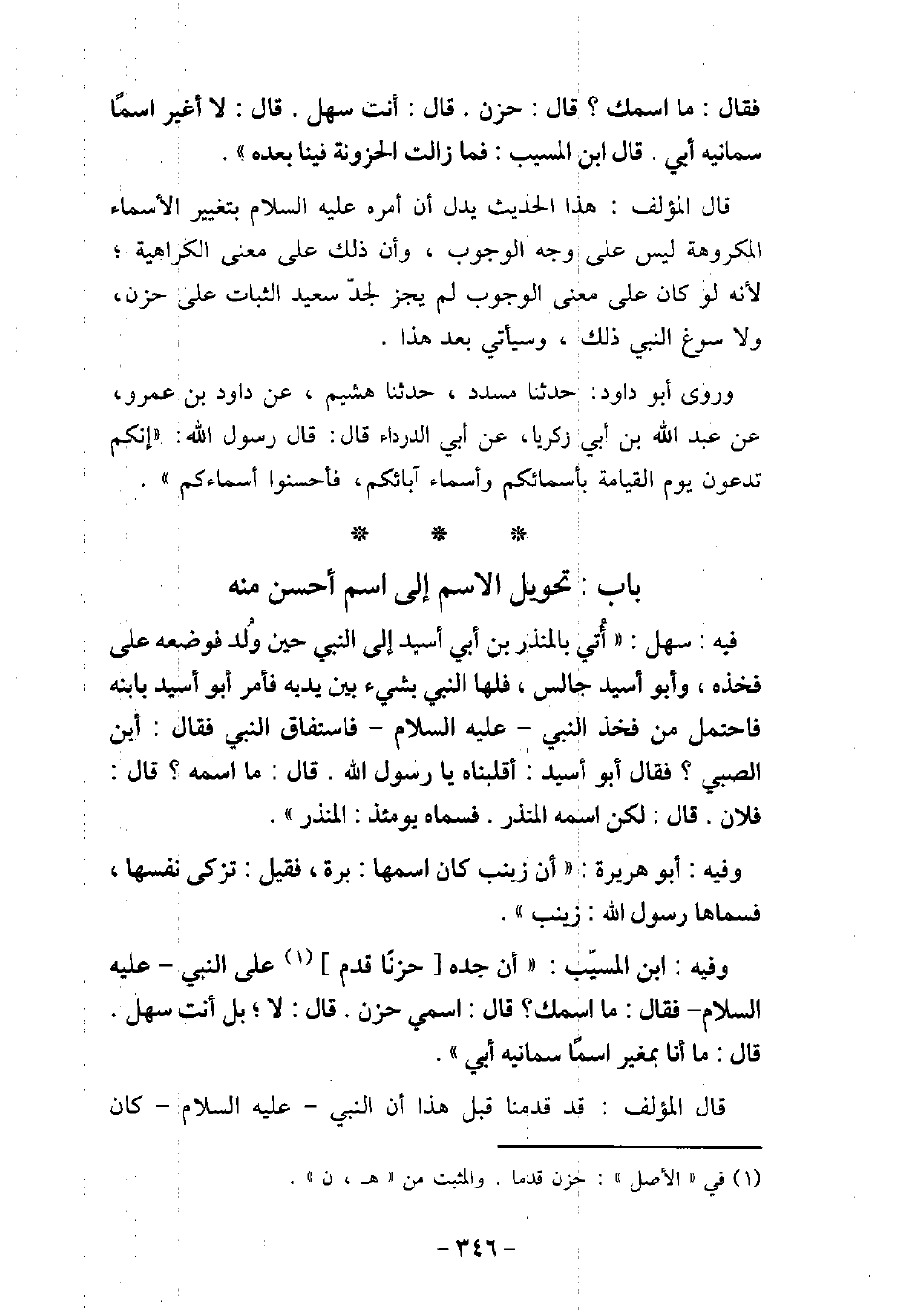/ 188 - فيه: سَهْل، أُتِىَ بِالْمُنْذِرِ بْنِ أَبِى أُسَيْدٍ إِلَى النَّبِي (صلى الله عليه وسلم) حِينَ وُلِدَ، فَوَضَعَهُ عَلَى فَخِذِهِ، وَأَبُو أُسَيْدٍ جَالِسٌ، فَلَهَا النَّبِي عليه السلام بِشَىْءٍ بَيْنَ يَدَيْهِ، فَأَمَرَ أَبُو أُسَيْدٍ بِابْنِهِ، فَاحْتُمِلَ مِنْ فَخِذِ النَّبِي (صلى الله عليه وسلم) ، فَاسْتَفَاقَ النَّبِي (صلى الله عليه وسلم) ، فَقَالَ: (أَيْنَ الصَّبِىُّ) ؟ فَقَالَ أَبُو أُسَيْدٍ: قَلَبْنَاهُ يَا رَسُولَ اللَّهِ، قَالَ: (مَا اسْمُهُ) ؟ قَالَ: فُلانٌ، قَالَ: (لَكِنْ أَسْمِهِ الْمُنْذِرَ) ، فَسَمَّاهُ يَوْمَئِذٍ الْمُنْذِرَ. / 189 - وفيه: أَبُو هُرَيْرَةَ، أَنَّ زَيْنَبَ كَانَ اسْمُهَا بَرَّةَ، فَقِيلَ: تُزَكِّى نَفْسَهَا، فَسَمَّاهَا رَسُولُ اللَّهِ عليه السلام زَيْنَبَ. / 190 - وفيه: ابْن الْمُسَيَّب، أَنَّ جَدَّهُ حَزْنًا قَدِمَ عَلَى النَّبِي (صلى الله عليه وسلم) فَقَالَ: (مَا اسْمُكَ) ؟ قَالَ: اسْمِى حَزْنٌ، قَالَ: (بَلْ، أَنْتَ سَهْلٌ) ، قَالَ: مَا أَنَا بِمُغَيِّرٍ اسْمًا سَمَّانِيهِ أَبِى. قال المؤلف: قد قدمنا قبل هذا أن النبي عليه السلام كان