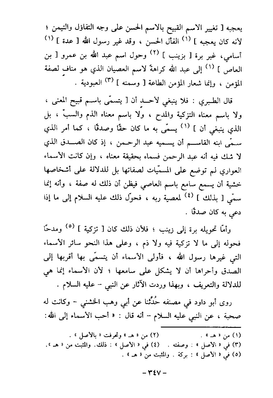 يعجبه تغيير الاسم القبيح بالاسم الحسن على وجه التفاؤل والتيمن؛ لأنه كان يعجبه الفأل الحسن، وقد غير رسول الله عدة أسامى، غير برة بزينب وحول اسم عبد الله بن عمرو بن العاص إلى عبد الله كراهة لاسم العصيان الذى هو مناف لصفة المؤمن، وإنما شعار المؤمن الطاعة وسمته العبودية. قال الطبرى: فلا ينبغى لأحد أن يتسمى باسم قبيح المعنى، ولا باسم معناه التزكية والمدجح، ولا باسم معناه الذم والسب، بل الذى ينبغى أن يسمى به ما كان حقًا وصدقًا، كما أمر الذى سمى بنه القاسم أن يسميه عبد الرحمن، إذ كان الصدق الذى لا شك فيه أنه عبد الرحمن فسماه بحقيقة معناه، وإن كانت الأسماء العوارى لم توضع على المسميات لصفاتها بل للدلالة على أشخاصها خشية أن يسمع سامع باسم العاصى فيظن أن ذلك له صفة، وأنه إنما سمى بذلك لمعصية ربه، فحول ذلك عليه السلام إلى ما لإذا دعى به كان صدقًا. وأما تحويله بره إلى زينب؛ فلأن ذلك كان تزكية ومدحًا فحوله إلى ما لا تزكيه فيه ولا ذم، وعلى هذا النحو سائر الأسماء التى غيرها رسول الله، فأولى الأسماء أن يتسمى بها أقربها إلى الصدق وأحرها أن لا يشكل على سامعها؛ لأن الأسماء إنما هى للدلالة والتعريف، وبهذا وردت الآثار عن النبى - عليه السلام. روى أبو داود فى مصنفه حدثنا عن أبى وهب الخشنى - وكانت له صحبة، عن النبى عليه السلام أنه قال: (أحب الأسماء إلى الله: