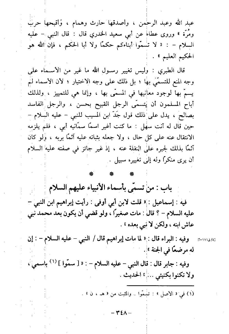 / 191 - فيه: إِسْمَاعِيلُ، قُلْتُ لابْنِ أَبِى أَوْفَى: رَأَيْتَ إِبْرَاهِيمَ ابْنَ النَّبِى (صلى الله عليه وسلم) ؟ قَالَ: مَاتَ صَغِيرًا، وَلَوْ قُضِىَ أَنْ يَكُونَ بَعْدَ مُحَمَّدٍ عليه السلام نَبِىٌّ عَاشَ ابْنُهُ، وَلَكِنْ لا نَبِىَّ بَعْدَهُ. / 192 - وفيه: الْبَرَاءَ، قَالَ: لَمَّا مَاتَ إِبْرَاهِيمُ قَالَ النَّبِىّ (صلى الله عليه وسلم) : (إِنَّ لَهُ مُرْضِعًا فِى الْجَنَّةِ) . / 193 - وفيه: جَابِر، قَالَ النَّبيّ (صلى الله عليه وسلم) : (سَمُّوا بِاسْمِى، وَلا تَكْتَنُوا بِكُنْيَتِى. . .) الحديث.