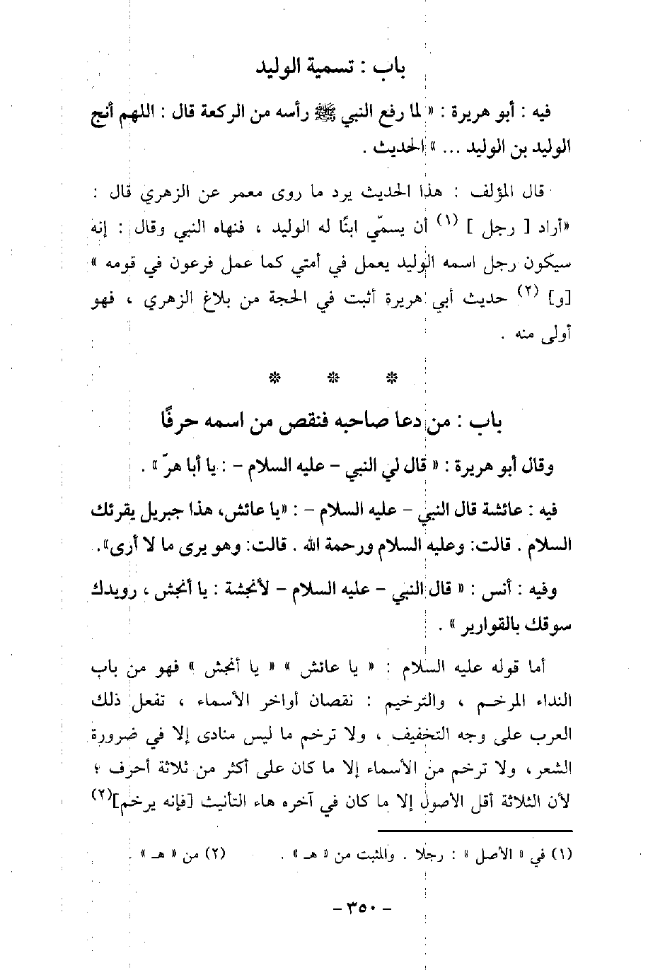 وَقَالَ أَبُو هُرَيرَةَ: قَالَ لىِّ النَّبِىَ (صلى الله عليه وسلم) : (يَا أَبَا هر) . / 198 - فيه: عَائِشَةَ، قَالَ النَّبِىّ، عليه السَّلام: (يَا عَائِشَ، هَذَا جِبْرِيلُ يُقْرِئُكِ السَّلامَ) ، قُلْتُ: وَعَلَيْهِ السَّلامُ وَرَحْمَةُ اللَّهِ، قَالَتْ: وَهُوَ يَرَى مَا لا أَرَى. / 199 - وفيه: أَنَس، قَالَ النَّبِىّ (صلى الله عليه وسلم) لأَنْجَشَةُ: (يَا أَنْجَشُ، رُوَيْدَكَ، سَوْقَكَ بِالْقَوَارِيرِ) . أما قوله عليه السلام: (ياعائش) (يا أنجش) فهو من باب النداء المرخم، والترخيم: نقصان أواخر الأسماء، تفعل ذلك العرب على وجه التخفيف، ولاترخم ماليس منادى إلا فى ضرورة الشعر ولاترخم من الأسماء إلا ماكان من ثلاثة أحرف؛ لأن الثلاثة أقل الأصول إلا ماكان فى آخره هاء التأنيث فإنه يرخم
