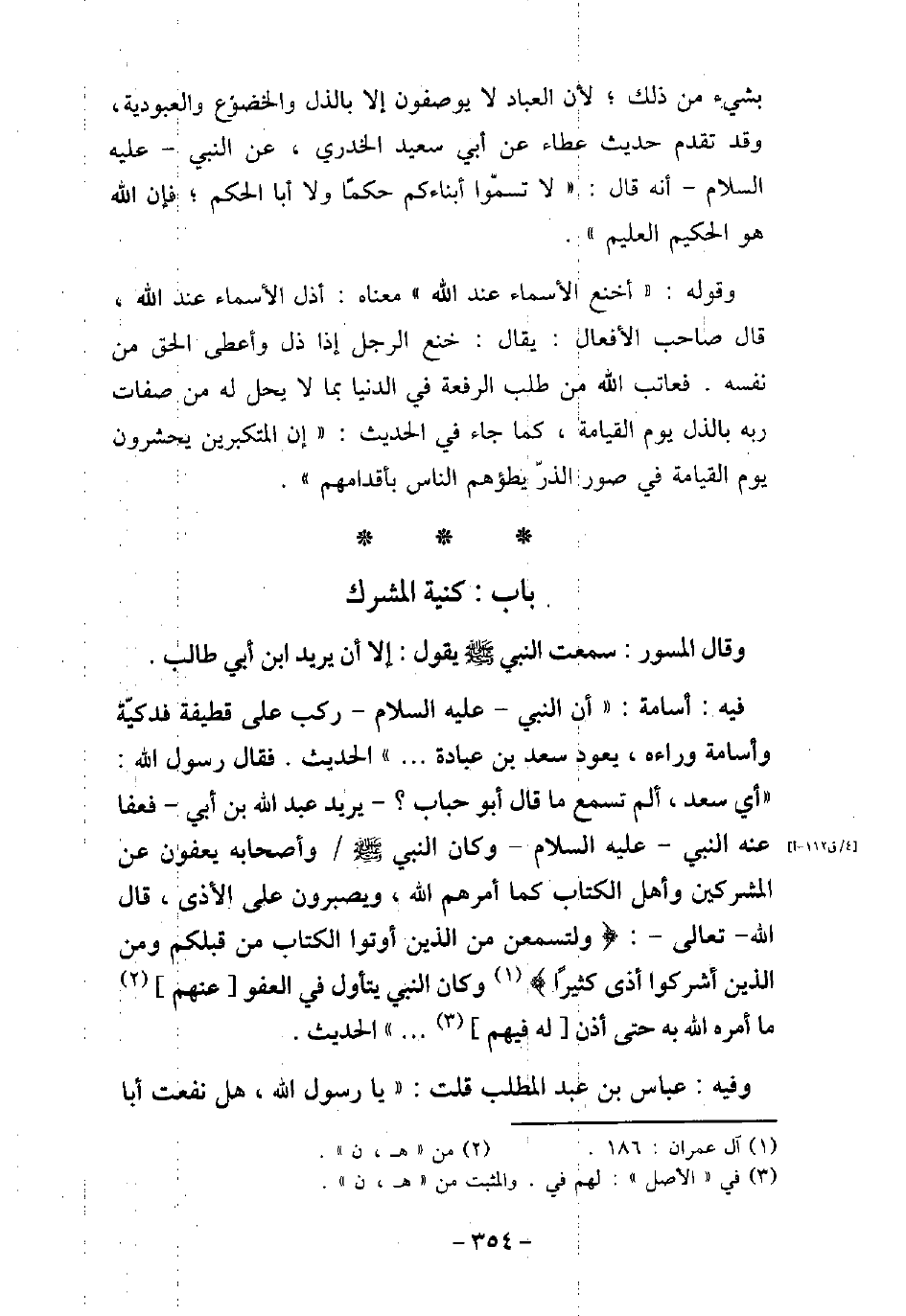 وَقَالَ الْمِسْوَرٌ: سَمِعْتُ النَّبِى عليه السلام يَقُولُ: (إِلا أَنْ يُرِيدَ ابْنُ أَبِى طَالِبٍ) . / 204 - فيه: أُسَامَةَ، أَنَّ النَّبِىّ (صلى الله عليه وسلم) رَكِبَ عَلَى حِمَارٍ عَلَيْهِ قَطِيفَةٌ فَدَكِيَّةٌ، وَأُسَامَةُ وَرَاءَهُ يَعُودُ سَعْدَ بْنَ عُبَادَةَ. . . الحديث، فَقَالَ رَسُولُ اللَّهِ (صلى الله عليه وسلم) : (أَى سَعْدُ، أَلَمْ تَسْمَعْ مَا قَالَ أَبُو حُبَابٍ) - يُرِيدُ عَبْدَاللَّهِ بْنَ أُبَىٍّ -؟ فَعَفَا عَنْهُ النَّبِىّ (صلى الله عليه وسلم) ، وَكَانَ النَّبِىّ (صلى الله عليه وسلم) وَأَصْحَابُهُ يَعْفُونَ عَنِ الْمُشْرِكِينَ وَأَهْلِ الْكِتَابِ كَمَا أَمَرَهُمُ اللَّهُ، وَيَصْبِرُونَ عَلَى الأذَى، قَالَ اللَّهُ تَعَالَى: (وَلَتَسْمَعُنَّ مِنِ الَّذِينَ أُوتُوا الْكِتَابَ من قبلكم ومن الذين أشركوا أذى كثيرًا (وَكَانَ النَّبِىّ عليه السلام يَتَأَوَّلُ فِى الْعَفْوِ عَنْهُمْ مَا أَمَرَهُ اللَّهُ بِهِ حَتَّى أَذِنَ لَهُ فِيهِمْ. . . الحديث. / 205 - وفيه: عباس بن عبد المطلب، قلت: يا رسول الله، هل نفعت أبا