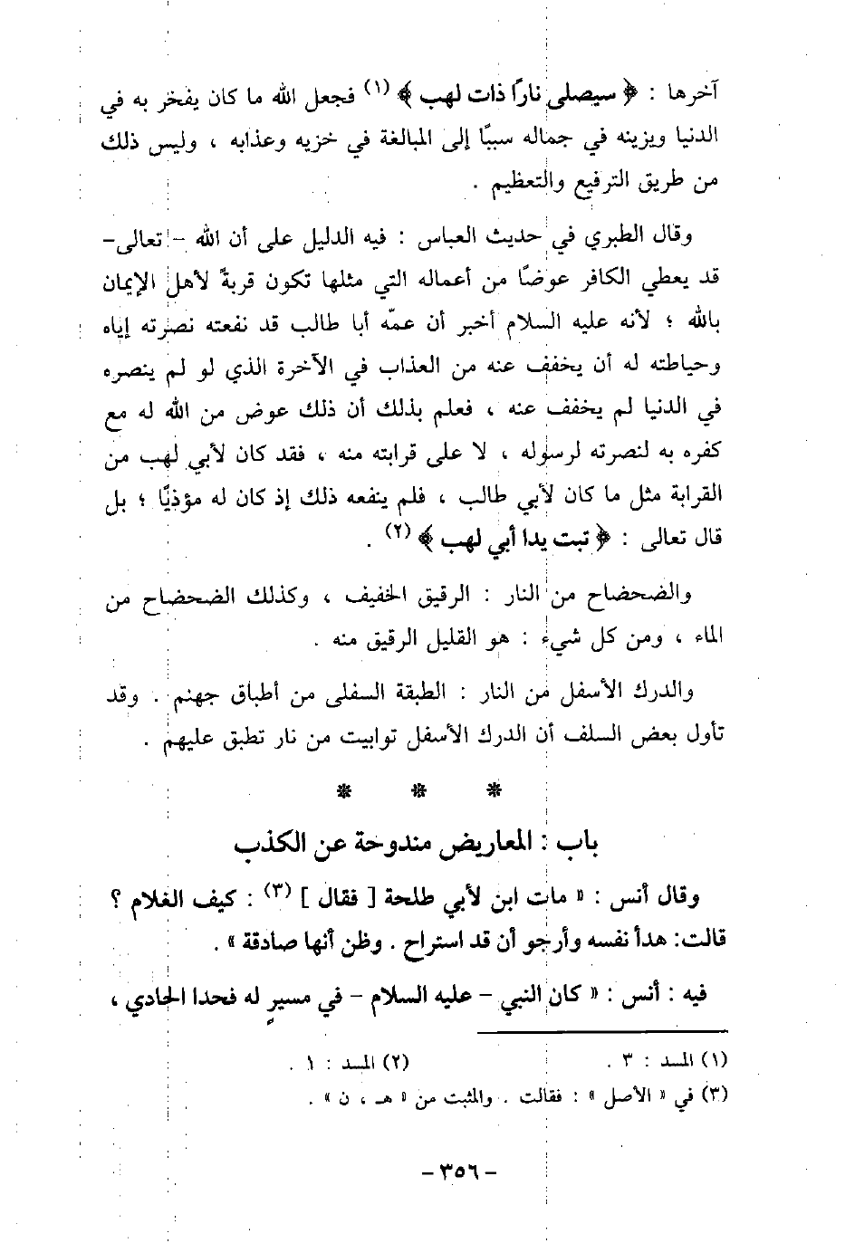 (سيصلى نارًا ذات لهب) فجعل الله ماكان يفخر به فى الدنيا ويوينه فى جماله سببًا إلى المبالغة فى خزيه وعذابه، وليس ذلك من طريق الترفيع والتعظيم. وقال الطبرى فى حديث العباس: فيه الدليل على أن الله تعالى قد يعطى الكافر عوضًا من أعماله التى مثلها تكون قربة لأهل الإيمان بالله؛ لأنه عليه السلام أخبر أن عمه أبا طالب قد نفعته نصرته إياه وحياطته له أن يخفف عنه من العذاب فى الآخرة الذى لو لم ينصره فى الدنيا لم يخفف عنه، فعلم بذلك أن ذلك عوض من الله له مع كفره به لنصرته لرسوله، لا على قرابته منه، فقد كان لأبى لهب من القرابة مثل ماكان لأبى طالب، فلم ينفعه ذلك إذ كان له مؤذيا؛ بل قال تعالى: (تبت يدا أبى لهب) . والضحضاح من النار: الرقيق الخفيف، وكذلك الضحضاح من الماء، ومن كل شىء: هو القليل الرقيق منه. والدرك الأسفل من النار: الطبقة السفلى من أطباق جهنم. وقد تأول بعض السلف أن الدرك الأسفل توابيت من نار تطبق عليهم.