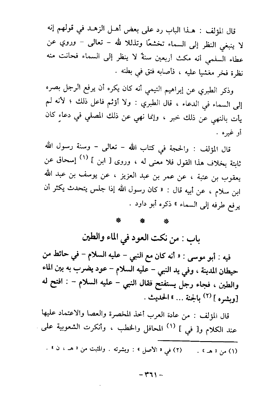 قال المؤلف: هذا الباب رد على بعض أهل الزهد فى قولهم أنه لا ينبغى النظر إلى السماء تخشعًا وتذللاً لله تعالى. وروى عن عطاء السلمى أنه مكث أربعين سنة لا ينظر إلى السماء فحانت منه نظرة فخر مغشيًا عليه، فأصابه فتق فى بطنه. وذكر الطبرى عن إبراهيم التيمى أنه كان يكره أن يرفع الرجل بصره الس السماء فى الدعاء، قال الطبرى: ولا أؤثم فاعل ذلك؛ لأنه لم يأت بالنهى عن ذلك خبر، وإنما عن ذلك المصلى فى دعاء كان أو غيره. قال المؤلف: والحجة فى كتاب الله تعالى وسنة رسول الله ثابتة بخلاف هذا القول فلا معنى له، وروى ابن إسحاق عن يعقوب بن عتبة، عن عمر بن عبد العزيز، عن يوسف بن عبد الله ابن سلام، عن أبيه قال: (كان رسول الله إذا جلس يتحدث يكثر أن يرفع طرفه إلى السماء) ذكره أبو داود.