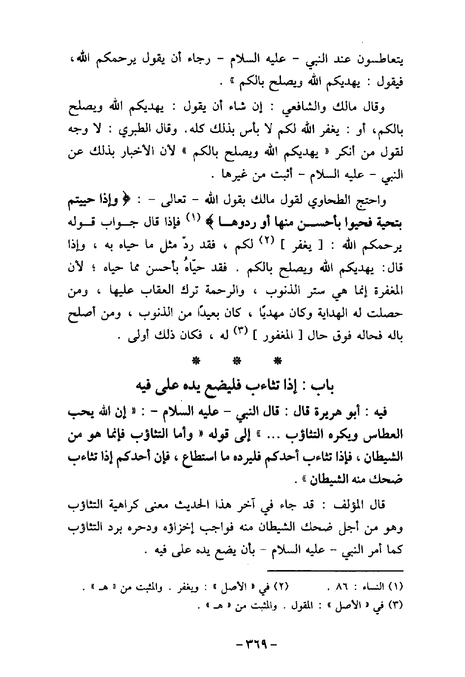 / 221 - فيه: أَبُو هُرَيْرَةَ، قَالَ: قَالَ النَّبِى (صلى الله عليه وسلم) : (إِنَّ اللَّهَ يُحِبُّ الْعُطَاسَ، وَيَكْرَهُ التَّثَاؤُبَ. . .) إلى قوله: (وَأَمَّا التَّثَاؤُبُ، فَإِنَّمَا هُوَ مِنَ الشَّيْطَانِ، فَإِذَا تَثَاءَبَ أَحَدُكُمْ، فَلْيَرُدَّهُ مَا اسْتَطَاعَ، فَإِنَّ أَحَدَكُمْ إِذَا تَثَاءَبَ، ضَحِكَ مِنْهُ الشَّيْطَانُ) . قال المؤلف: قد جاء فى آخر هذا الحديث معنى كراهية التثاءب وهو من أجل ضحك الشيطان منه فواجب إخزاؤه ودحره برد التثاؤب كما أمر النبى عليه السلام بأن يضع يده على فيه.