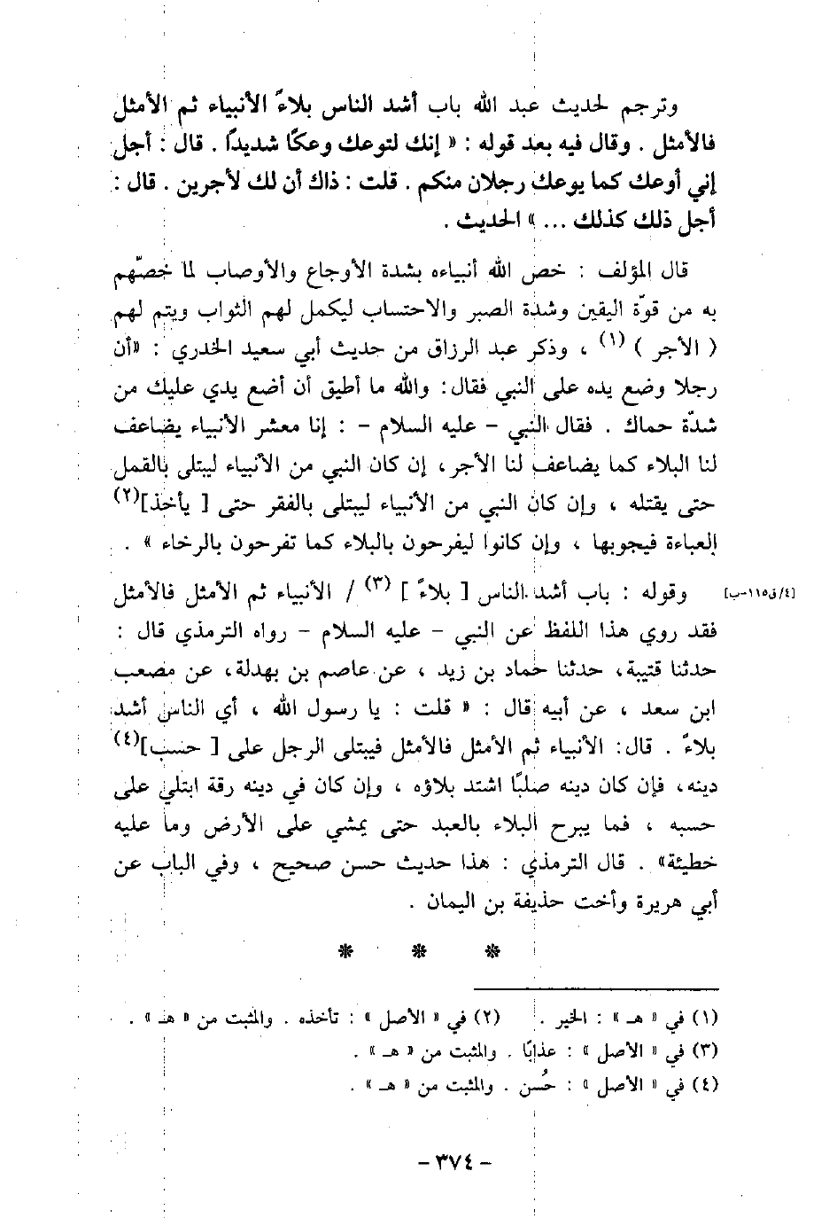 وترجم لحديث عبد الله باب أشد الناس بلاء الأنبياء ثم الأمثل فالأمثل. وقال فيه بعد قوله: (إنك لتوعك وعكًا شديدًا. قال: أجل إنى أوعك كما يوعك رجلان منكم. قلت: ذاك أن لم لأجرين. قال أجل ذلك كذلك. .) الحديث. قال المؤلف: خص الله أنبياءه الأوجاع والأصواب لما خصهم به من قوة اليقين وشدة الصبر والاحتساب ليكمل لهم الثواب ويتم لهم الأجر وذكر عبد الرزاق من حديث أبى سعيد الخدرى: (أن رجلا وضع يده على النبى فقال: والله ماأطيق أن أضع يدى عليك من شدة حماك. فقال النبى (صلى الله عليه وسلم) : إنا معشر الأنبياء يضاعف لنا البلاء كما يضاعف لنا الأجر، إن كان النبي من الأنبياء ليبتلى بالقمل حتى يقتله، وإن كان النبي من من الأنبياء ليبتلى بالفقر حتى يأخذ العباءة فيجوبها، وإن كانوا ليفرحون بالبلاء كما تفرحون بالرخاء) . وقوله: باب أشد الناس بلاء الأنبياء ثم الأمثل فالأمثل فقد روى هذا اللفظ عن النبى عليه السلام رواه الترمدذى قال: حدثنا قتيبة، حدثنا حماد بن زيد، عن عاصم بن بهدلة، عن مصعب ابن سعد، عن أبيه قال: (يارسول الله، أى الناس أشد بلاء. قال: الأنبياء ثم الأمثل فالأمثل فيبتلى الرجل على حسب دينه، فإن كان دينه صلبًا أشتد بالؤه، وإن كان فى دينه رقه ابتلى على حسبه، فما يبرح البلاء بالعبد حتى يمشى على الأرض وما عليه خطيئة) . قال الترمذى: هذا الحديث حسن صحيح، وفى الباب عن أبى هريرة وأخت حذيفة اليمان.