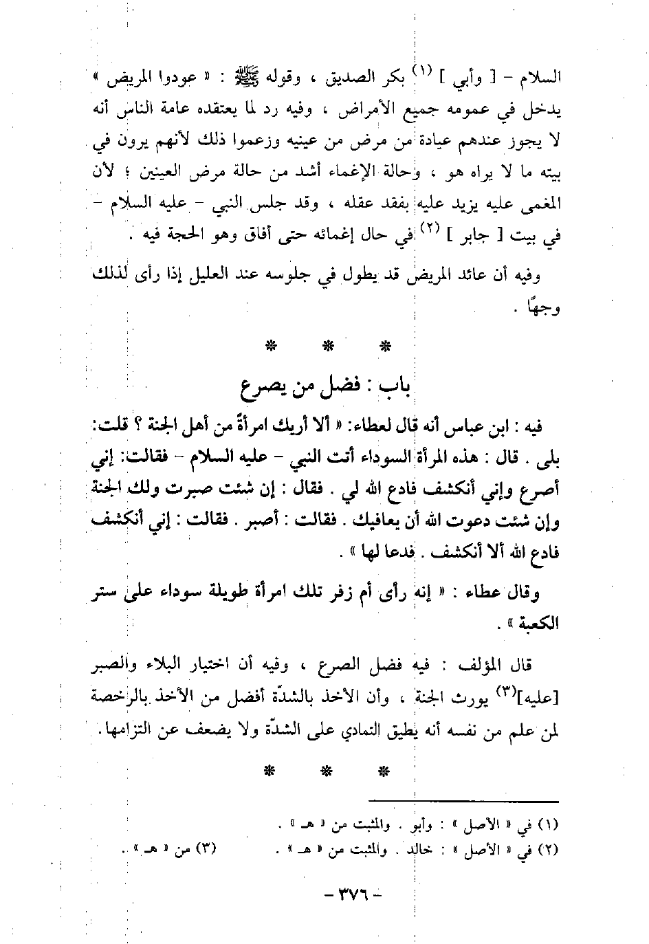 / 11 - فيه: ابْن عَبَّاس أَنَّهُ قَالَ لِعَطَاء: (أَلا أُرِيكَ امْرَأَةً مِنْ أَهْلِ الْجَنَّةِ) ؟ فقُلْتُ: بَلَى، قَالَ: هَذِهِ الْمَرْأَةُ السَّوْدَاءُ أَتَتِ النَّبِى (صلى الله عليه وسلم) ، فَقَالَتْ: إِنِّى أُصْرَعُ، وَإِنِّى أَتَكَشَّفُ فَادْعُ اللَّهَ لِى، قَالَ: (إِنْ شِئْتِ صَبَرْتِ وَلَكِ الْجَنَّةُ، وَإِنْ شِئْتِ دَعَوْتُ اللَّهَ أَنْ يُعَافِيَكِ) ، فَقَالَتْ: أَصْبِرُ، فَقَالَتْ: إِنِّى أَتَكَشَّفُ، فَادْعُ اللَّهَ لِى أَنْ لا أَتَكَشَّفَ، فَدَعَا لَهَا. وَقَالَ عَطَاءٌ: أَنَّهُ رَأَى أُمَّ زُفَرَ تِلْكَ امْرَأَةً طَوِيلَةً سَوْدَاءَ عَلَى سِتْرِ الْكَعْبَةِ. قال المؤلف: فيه فضل الصع، وفيه أن اختيار البالء والصبر عليه يورث الجنة، وأن الأخذ بالشدة أفضل من الأخذ بالرخصة لمن علم من نفسه أنه يطيق التمادى على الشدة ولايضعف عن التزامها.