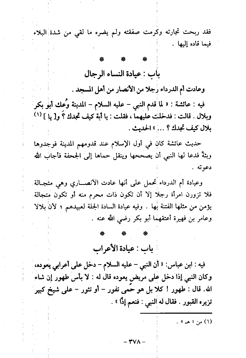 / 13 - فيه: عَائِشَةَ، لَمَّا قَدِمَ النَّبِىّ عليه السلام الْمَدِينَةَ وُعِكَ أَبُو بَكْرٍ وَبِلالٌ، قَالَتْ: فَدَخَلْتُ عَلَيْهِمَا، فقُلْتُ: يَا أَبَتِ، كَيْفَ تَجِدُكَ؟ وَيَا بِلالُ، كَيْفَ تَجِدُكَ؟ . . . . الحديث. حديث عائشة كان فى أول الإسلام عند قدزمهم المدينة فوجدوها وبئة فدعا لها النبى أن يصححها وينقل حماها إلى الجحفة فأجاب الله دعوته. وعيادة أم الدرداء تحمل على أنها عادت الأنصارى وهى متجالة فلا تزورون امرأة رجلا إلا أن تكون ذات محرم أو تكون متجالة يؤمن من مثلها الفتنة بها. وفيه عيادة السادة الجلة لعبيدهم؛ لأن بلالا وعامر بن فهيرة اعتقلهما أبو بكر رضى الله عنه.